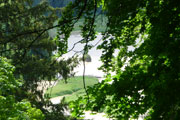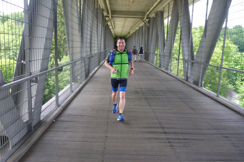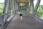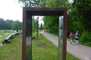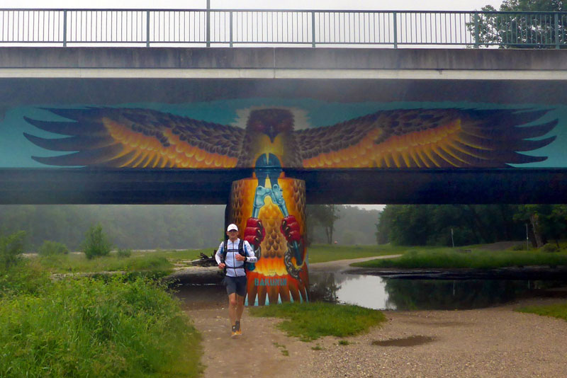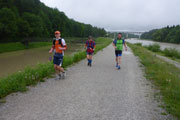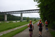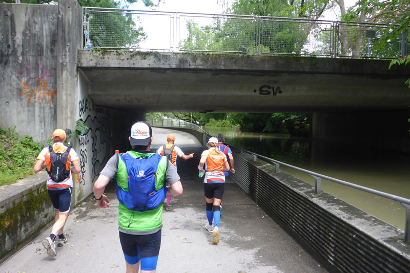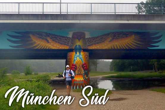 Zwischen km 5 – 6 ziehen wir am Tierpark Hellabrunn vorbei. Wir passieren das Elchgehege. In etwas Abstand ist durch das dichte Gewächs ein Elchbulle und ein junges Elchkalb zu sehen. Am Steg „An der Marienklause“ überqueren wir die Isar und laufen jetzt zwischen Isar und Isarwerkkanal weiter. Ein toller Abschnitt in Thalkirchen, wir sind vollkommen im Grünen.