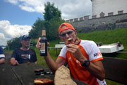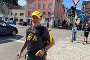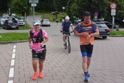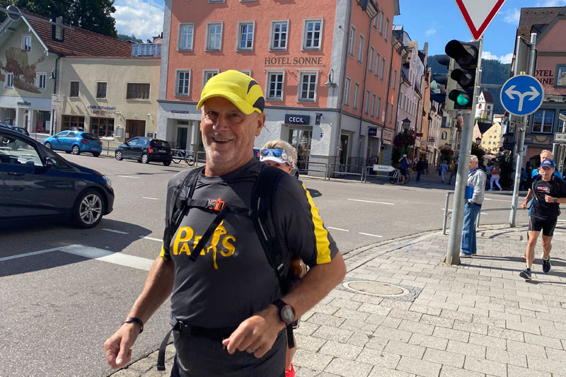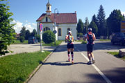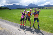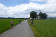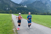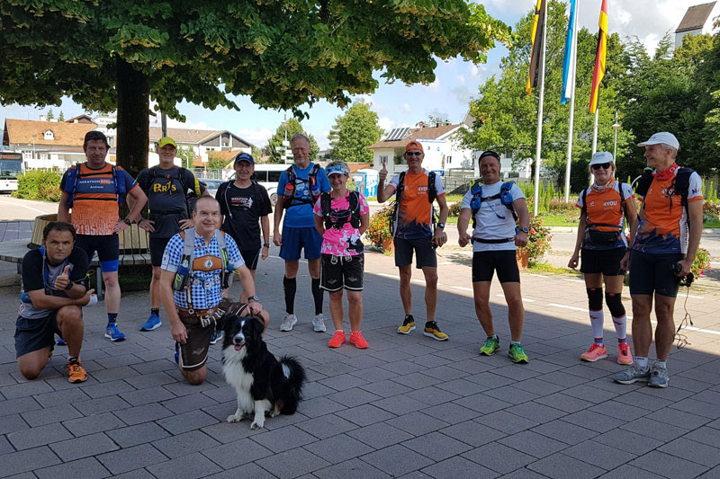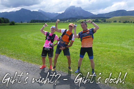 Auch wenn mir die richtigen Marathons fehlen, so erkenne ich doch, dass ein „Corona-Marathon“ auch seine Vorteile hat. Normalerweise wird der Marathon in Füssen am Sonntag um 07:30 Uhr gestartet. Wir starten in diesem Jahr am Samstag um 10:00 Uhr. Das bedeutet nicht nur, dass man am nächsten Tag ausschlafen kann, sondern auch, dass man in der Früh deutlich später aus den Federn kriechen muss. Es entfallen nämlich auch die Vorbereitungen, wie Starterbeutel holen, Startnummer dranpfriemeln und so weiter. Trotzdem sind wir gut eine halbe Stunde vor dem Start in Füssen. Wir wollen schließlich noch unsere Freunde begrüßen und tatsächlich sind auch alle da. Mit Kehli Englerth und Alois` Gattin hatten wir sogar zwei mobile Verpflegungsstationen. Martin übernahm die Funktion als „Besenradler“. Also fast alles wie bei einem richtigen Marathon.