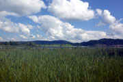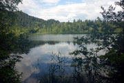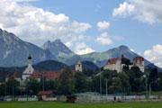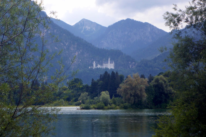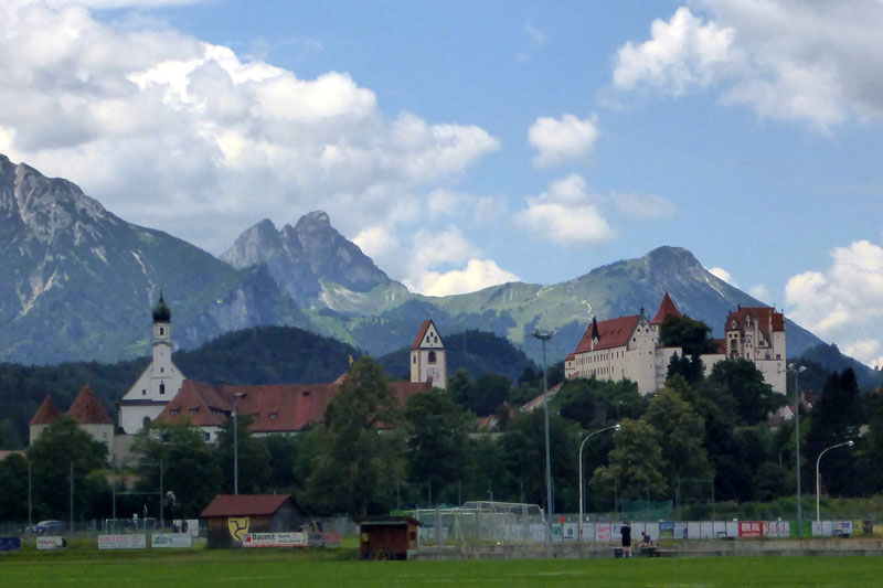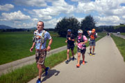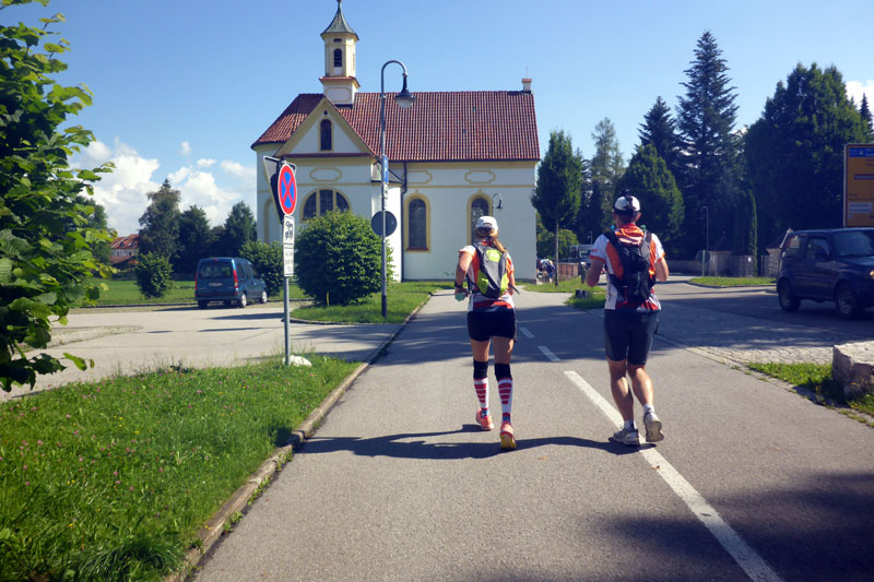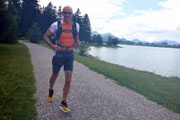 Pünktlich um 10:00 Uhr ging es dann auch in der Kemptner Straße los und wir haben nur ein paar hundert Meter bis wir Füssen hinter uns lassen. Es ist schon angenehm warm und es wird im Laufe des Tages mit Sicherheit noch wärmer. Obwohl nicht davon auszugehen ist, dass es eine ähnliche Hitzeschlacht wie bei meinen beiden vergangenen Teilnahmen werden wird, führen wir in unseren Laufrucksäcken ausreichend Flüssigkeit mit. Damit erregen wir wohl schon von Beginn an Aufmerksamkeit in Füssen, denn das Überqueren von ein paar wenigen Straßen wird uns von den Autofahrern problemlos ermöglicht. Und so machen wir uns auch schon bald auf den Weg in Richtung Hopfen, wo wir den gleichnamigen See anderthalbmal umrunden werden. Es bilden sich schon bald zwei Gruppen, wobei die Schnelleren immer nur ein paar Meter voraus sind.