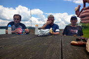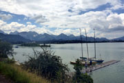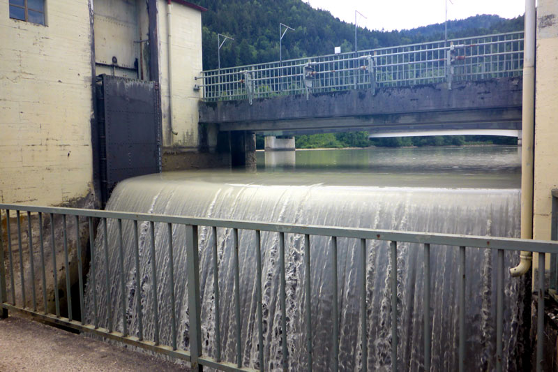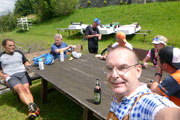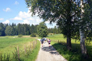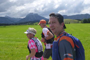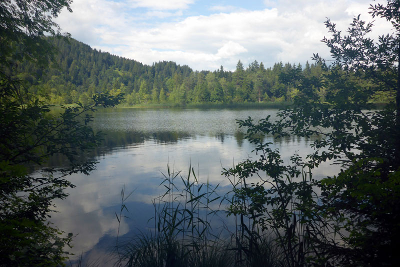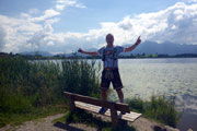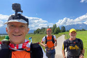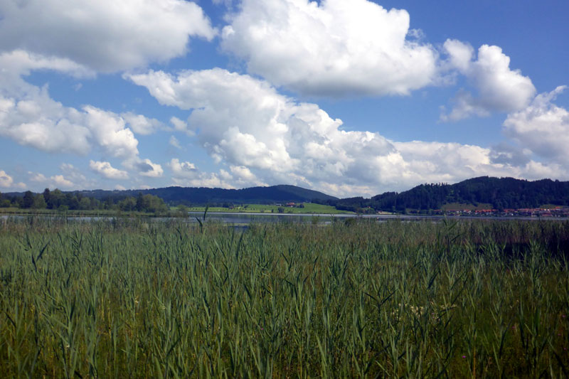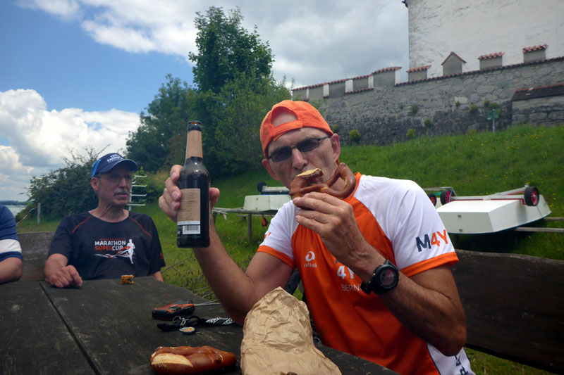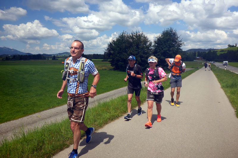 Auf dem Weg zum und rund um den Hopfensee begegnen wir immer wieder mal Radfahrern, Läufern und Wandern. Wir erhalten immer wieder einmal Applaus. Offenbar muss man gar nicht erklären, was wir hier treiben. Bei uns ebben derweil die Gespräche nicht ab. Es gibt viel zu berichten. Die meisten von uns haben sich lange nicht gesehen. Jürgen und ich stellen fest, dass wir 2015 gemeinsam in Füssen am Start waren. Ich will ihm am See angekommen erzählen, dass damals das Wasser an der Versorgungsstation ausgegangen war, was für mich ein großes Problem darstellte, da es sehr heiß war. Jürgen hatte die Situation selbst auch erleben müssen. Ein paar Kilometer später hätten uns am See normalerweise die Alphornbläser erwartet. In diesem Jahr vertritt sie Kehli. Zeit für eine erste kurze Trinkpause.