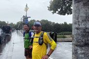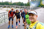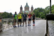 Die Klamottenwahl am Freitagabend fiel mir nicht leicht. Maximal 18 Grad und leichter Dauerregen waren vorhergesagt. Ich entschied mich natürlich für meine neue „Lederhose“ und ein kurzes Laufshirt, sowie eine kurze Regenjacke. Das musste reichen. Nach den vergangenen Hitzemarathons freute ich mich sogar auf die eigentlich ungemütlichen Bedingungen. Punkt neun Uhr am Samstagmorgen stand auch das gesamte Läufer-Quintett am Müllerschen Volksbad unweit des Deutschen Museum parat, um erneut den landschaftlich schönen Marathon an der Isar unter die Füße zu nehmen. Jürgen hatte noch vor Kurzem einen Hexenschuss, ich dagegen einen steifen Nacken, so dass wir schon vor dem Start witzelten, dass wir beiden „Wracks“, das Ding mal wieder gemeinsam vom Anfang bis zum Ende laufen werden. Am Ende lief es für uns beide aber, doch ganz gut. Die Beschwerden ließen sich „weglaufen“.