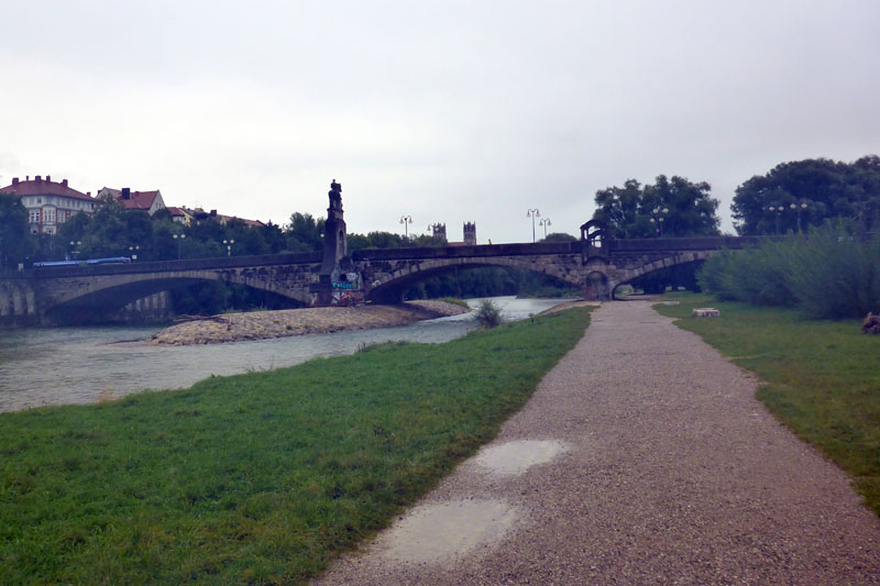 Wie gesagt, starteten wir nach einem gemeinsamen Gruppenfoto pünktlich um neun Uhr und es ging erst einmal 16 Kilometer lang in Richtung Süden, immer schön an der Isar entlang. Schon nach ein paar hundert Meter unterquerten wir die Ludwigsbrücke, dann ging es am Deutschen Museum vorbei, weiter unter der Cornelius- und kurz darauf unter der Reichenbachbrücke hindurch. Nun hatten wir nach gut anderthalb Kilometern die schönen Isarauen erreicht und diese konnten wir heute in vollen Zügen genießen. Dank des Wetters wagten sich eigentlich nur die hartgesottenen Hundebesitzer vor die Haustüre und so war es herrlich ruhig. Keine Spaziergänger oder Fahrradfahrer auf die es Rücksicht zu nehmen galt. Das gab uns sogar die Möglichkeit auf den geteerten Fahrradweg auszuweichen, da die Pfützen auf dem Fußweg kaum noch zu umlaufen waren.