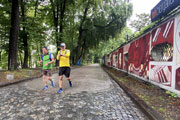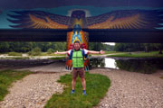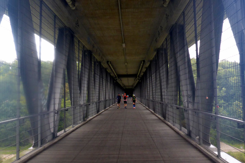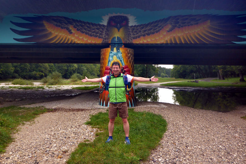 Nach der Wittelsbacher Brücke werden die Isarauen immer natürlicher und man kann sich kaum vorstellen, dass man gerade mitten durch München läuft. Es ist einfach schön. Nach jeder Brücke werfe ich inzwischen einen Blick zurück. Ich suche einen gigantischen Adler, den ein Graffiti-Künstler unterhalb einer Eisenbahnbrücke gesprüht hat. Unbemerkt von allen hatte ich da bei unserem letzten Lauf Bernie fotografiert. Das Motiv ist wirklich klasse und dieses Mal wollte ich auch ein Foto von mir und dem Adler. Bei der Braunauer Eisenbahnbrücke wurde ich dann fündig und es gab ein kurzes „Fotoshooting“.