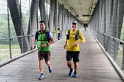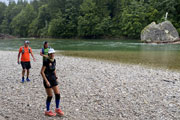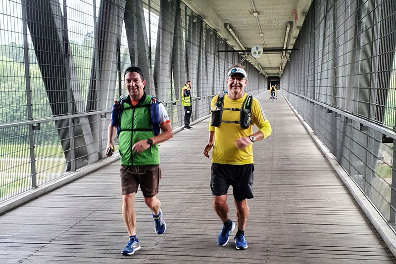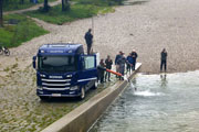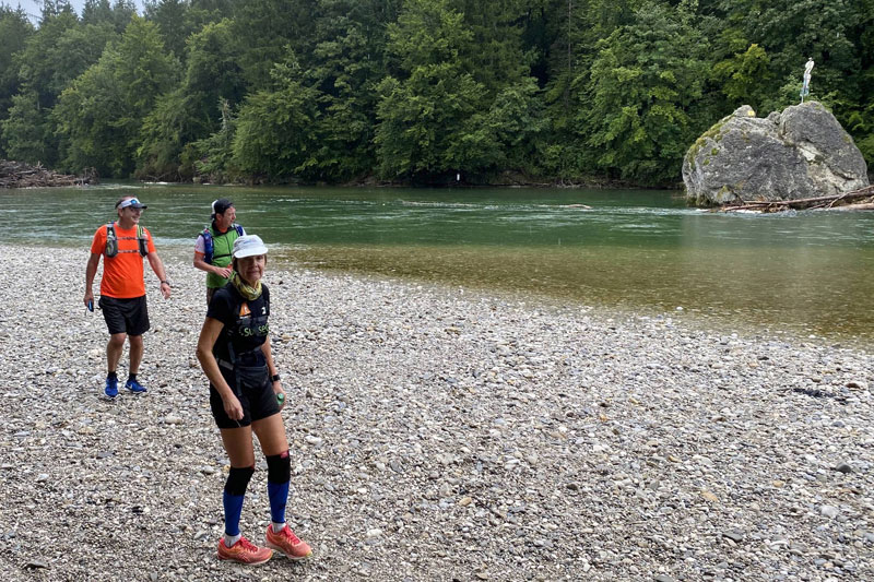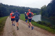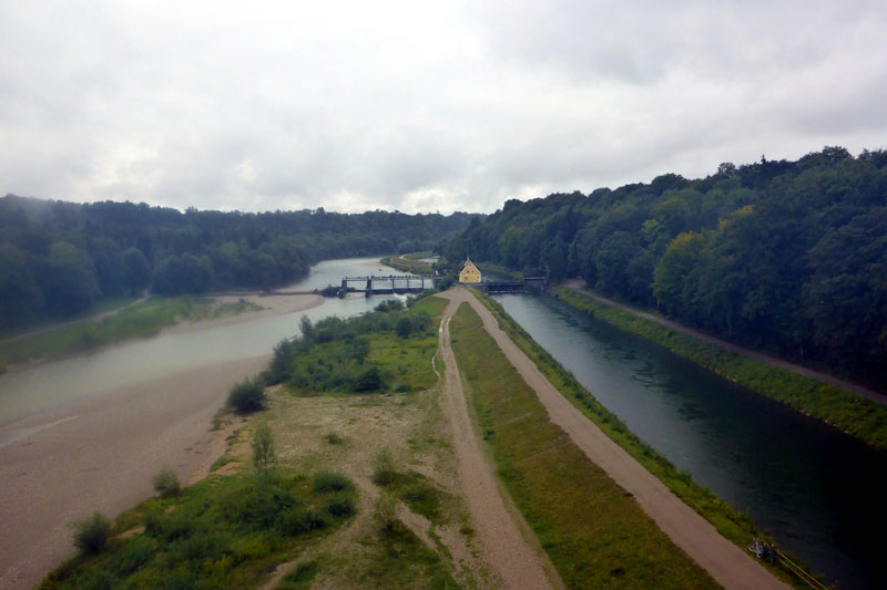 Bei Kilometer Fünf ging es dann am Münchner Tierpark „Hellabrunn“ vorbei und wieder konnten wir durch den Zaun Elche bewundern, die so frühmorgens noch im Gras lagen und wohl einem ruhigen Tag entgegenblicken konnten. Etwa einen Kilometer später wechselten wir über die Marienklausenbrücke auf die andere Isarseite und liefen nun zwischen Isar und Isarkanal auf dem Isardamm weiter in Richtung Süden. Einen kurzen Stopp mussten wir auf der Brücke aber doch noch einlegen. Fischer setzten eine Lkw-Ladung voller Fische in der Isar aus. Dabei wurde beim Lkw einfach die Wasserladung abgelassen und die Fische sausten mit dem Strahl in die Isar. Nachdem unsere Neugier gestillt war ging es weiter. An den leichten Regen hatten wir uns inzwischen alle gewöhnt und waren uns auch einig, dass es heute wesentlich angenehmer zu laufen ist, als bei den Temperaturen der vergangenen Wochen. Andreas und Jürgen diskutierten derweil, ob wir noch ein Wehr weiter laufen können, als beim letzten Mal. Sie waren sich nicht sicher, ob es bei Pullach eine Überquerungsmöglichkeit über die Isar gibt. Wir wollten es probieren und so ging es am Georgenstein vorbei weiter in Richtung Süden. Alles ging gut, die erhoffte Überquerung kam und so liefen wir bis etwa 17 Kilometer weiter bis wir den südlichsten Punkt unseres Marathons erreichten.