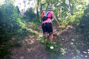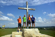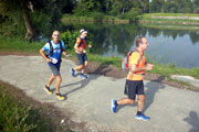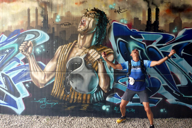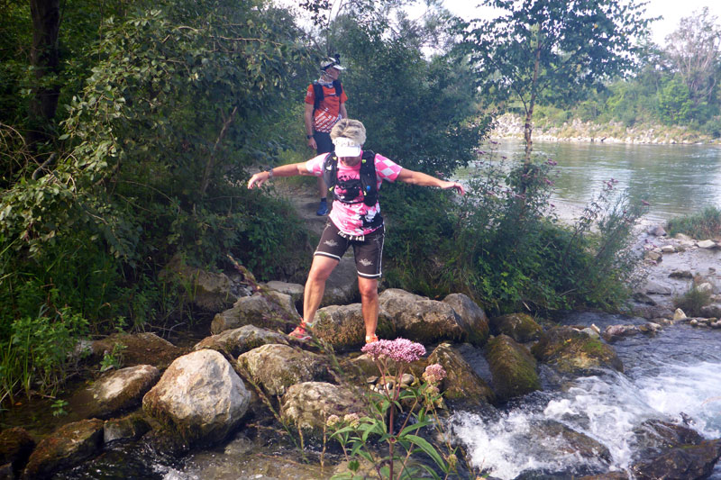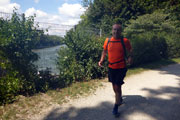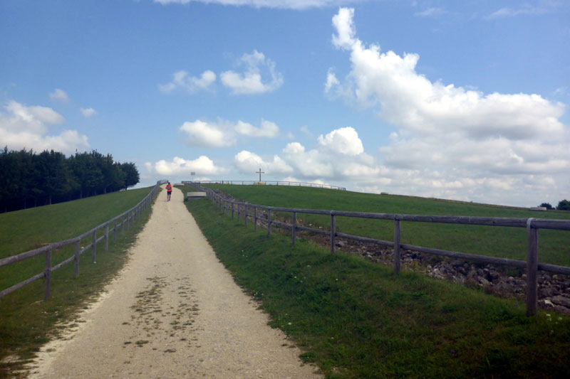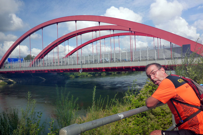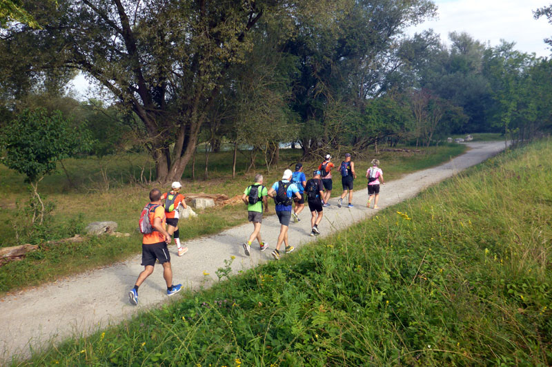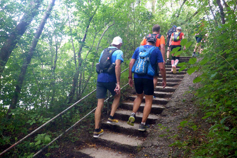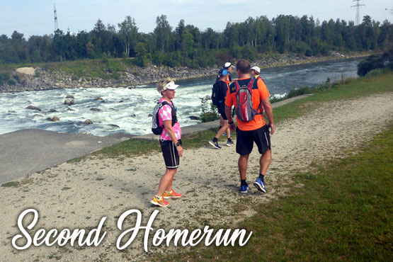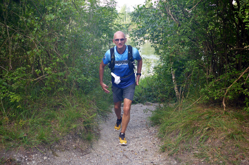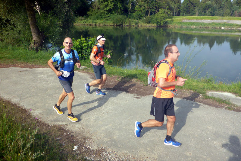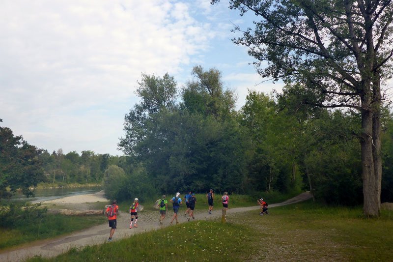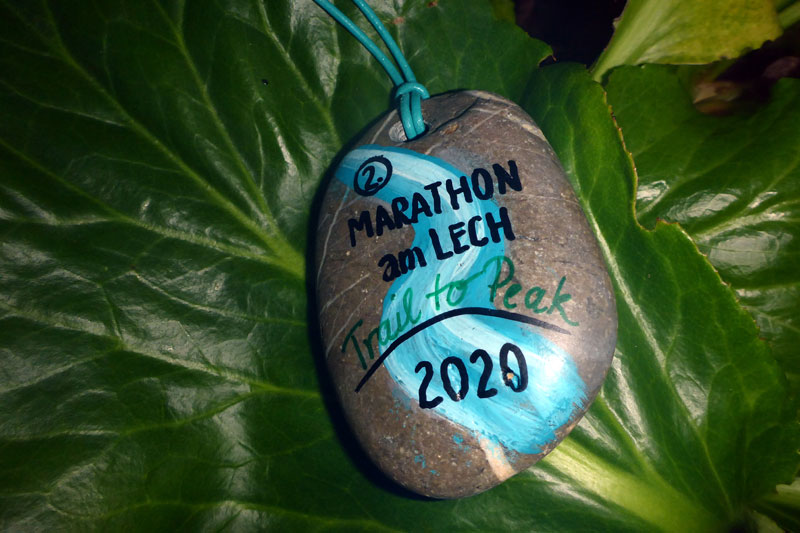 Wir laufen erst einmal gemeinsam. Bis zum Monte Scherbelino wollen wir zusammenbleiben, auch wenn sich die Gruppe immer wieder einmal auseinanderzieht. Es bilden sich kleine Grüppchen, wie immer gibt es viel zu erzählen. Etwas Sorge macht mir heute Jürgen. Er hat mir schon in Füssen von seinen Problemen nach einem Zeckenbiss erzählt. Bei ihm wurde Borreliose festgestellt und er hat seit mehreren Wochen gesundheitliche Probleme. Er ist sich nicht sicher, ob er diesen Lauf zu Ende bringen will. Die Teilnahme wollte er sich aber auf keinen Fall entgehen lassen. „Ich will diese Kieselperle auf alle Fälle“, das ist Jürgens Motivation und er meint Bernies liebevoll gestaltete Medaillen aus echten Lechkieseln.