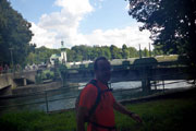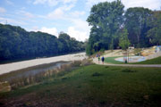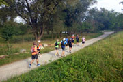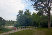 Auf der Strecke des Sportscheck-Halbmarathons geht es weiter bis zum Osram-Steg, über den wir auf dem Rückweg auf die andere Lechseite wechseln wollen. Es wird nun etwas trailiger, da wir nicht mehr die Wanderwege zum Laufen nutzen, sondern immer so nahe wie möglich am Lech laufen. Die ein oder andere Baustelle, bremst uns aus und wir klettern mal mehr oder weniger geschickt darüber hinweg. Mir macht das Laufen heute richtig Spaß, vor allem, da wir immer noch in einer größeren Gruppe zusammen sind.