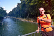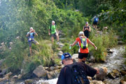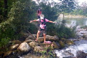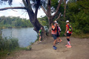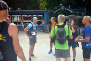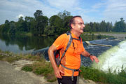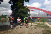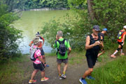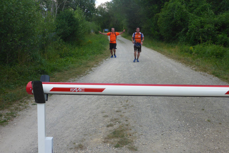 Auf vertrautem Terrain geht es zunächst immer am Lech entlang und schon nach zwei Kilometern tropft der Schweiß. Es ist zwar nicht mehr so heiß wie vor zwei Wochen am Ammersee, aber es ist schwülwarm. Wir kommen dennoch gut voran und lassen ein Lechwehr nach dem anderen hinter uns. Es sind Sechs an der Zahl und mit jedem Wehr haben wir einen weiteren Kilometer hinter uns. Bevor wir das erste kleine Zwischenziel, den Hochablass am Kuhsee erreicht haben, gilt es aber noch den „Canyon“ zu überqueren. Heute ist das nicht besonders anspruchsvoll, da die Steine trocken sind und der Wasserpegel moderat ist. Dennoch kann man den Unterschied zwischen den Canyon-Erfahrenen Team TOMJ`lern und dem Rest des Feldes beim Überqueren erkennen. Es kommen aber alle gut und trocken auf der anderen Seite an und die letzten Kilometer bis zum Kuhsee stehen an.