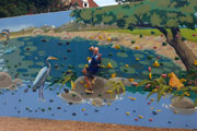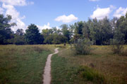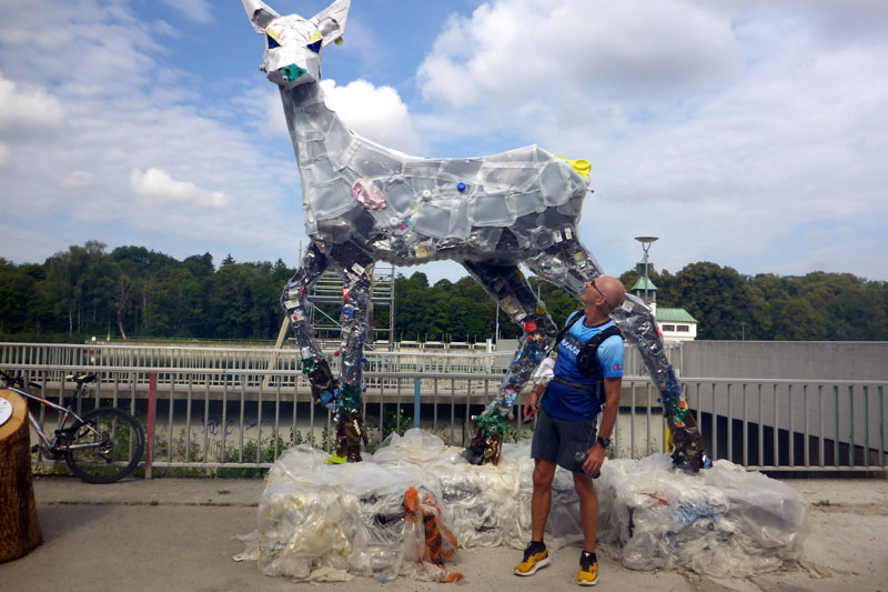 Am Kuhsee angekommen nutzen einige den Kiosk, um bereits aufgebrauchte Flüssigkeitsvorräte wieder aufzufüllen. Dadurch haben wir Zeit eine gigantisches Kunststoffreh zu bewundern, das seit Kurzem am Hochablass steht. Das Kunstwerk wurde aus Plastikmüll gefertigt, der im gegenüberliegenden Sieben-Tisch-Wald gesammelt wurde. Unglaublich was Leute, die vorgeben die Natur genießen zu wollen, dieser mit ihrer Ignoranz antun. Nach einem weiteren Gruppenfoto machen wir uns wieder auf die Socken bzw. Laufschuhe.