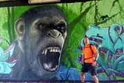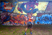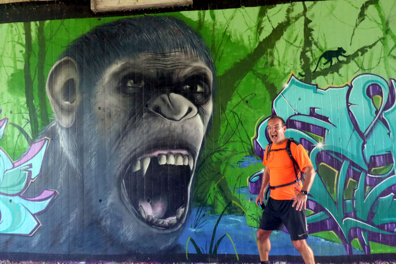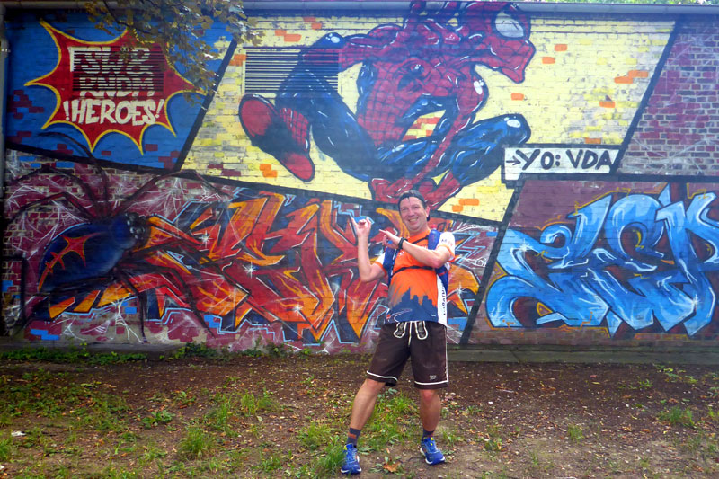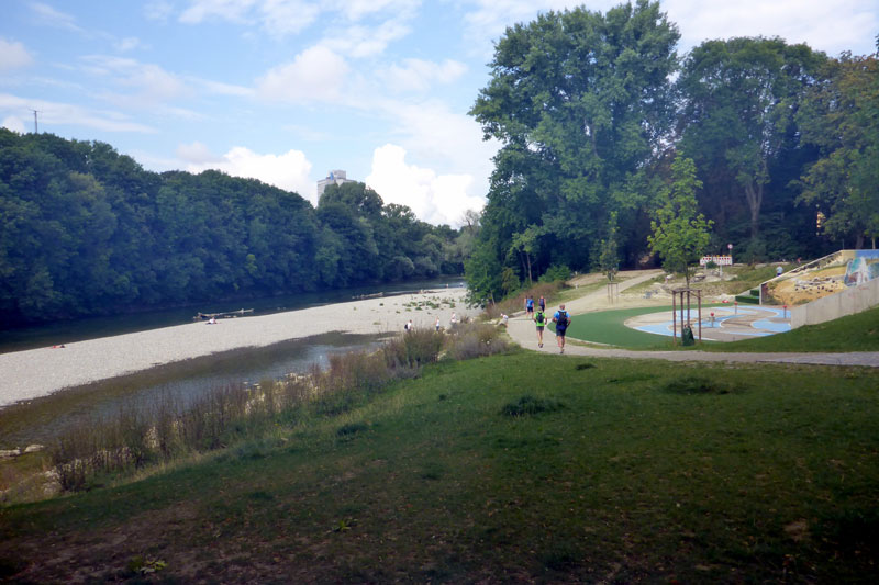 Bis zur Firnhaberau findet sich eine mit teils sehr schönen Graffitis verzierte Unterführung, die wir für ein paar Spaßfotos nutzen können und auch ein Spielplatz mit Boulderanlage kostet uns ein paar Minuten. Ist aber heute alles sowas von egal, wir haben jede Menge Spaß. Der Spaß hat für Jürgen aber kurz vor der Unterquerung der A8 ein Loch, denn Jürgen ist unterhopft. Wir finden in einer Kleingartenanlage mit gemütlichem Biergarten aber eine Lösung. Kati müsste eh mal wohin und so nutzen Jürgen und ich die kleine Pause für ein Helles to Go |