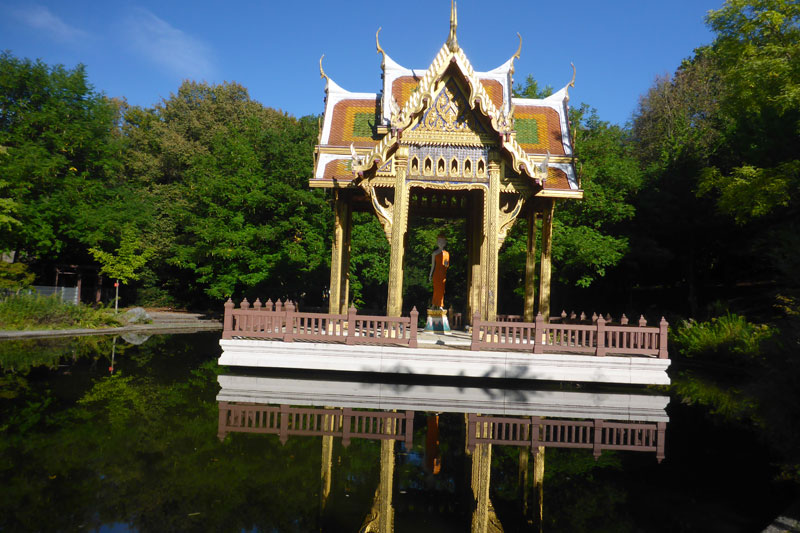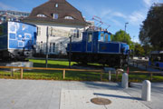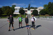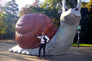 Für uns geht‘s da jetzt auch hinauf, nach insgesamt etwa einer halben Wiesn-Runde verlassen wir nach rechts durch eine Fußgängerunterführung das Gelände und kommen nach einem kurzen Anstieg, direkt am Verkehrszentrum, einer Außenstelle des Deutschen Museums wieder raus. Auf 12.000 qm wird hier die Geschichte, Gegenwart und Zukunft der Mobilität präsentiert mit vielen historischen Eisenbahnen, Autos, Motorrädern, Fahrrädern und Kutschen. Wie die große Schnecke auf dem riesigen Vorplatz hier dazu passt, weiß ich nicht so recht, man wird sie aber hoffentlich nicht wegen unseres Tempos aufgestellt haben. Eilig haben wir es aber natürlich nicht, uns geht’s mehr ums Vergnügen. |