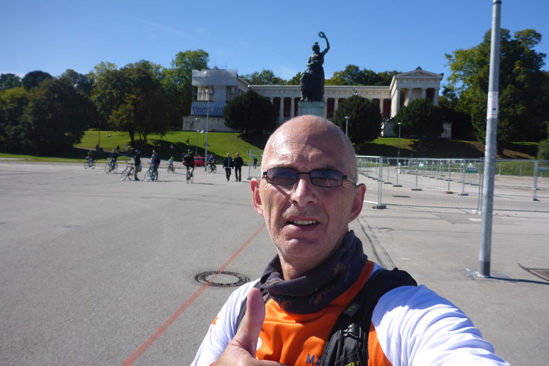 Judith wartet am Sonntagmorgen auf der Theresienwiese an der Matthias-Pschorr-Straße auf uns und erzählt uns erst einmal, dass Andreas auch noch wegen Krankheit absagen muss. Unser Startplatz liegt genau auf der gegenüberliegenden Seite der Bavaria. Ursprünglich wollten wir ja bereits gestern an den Start gehen, aber grausliges Wetter sorgte für die kurzfristig Verlegung. Für fünf, bzw. vier Personen lässt sich das natürlich auch relativ problemlos regeln. Unglaublich, wie sich innerhalb weniger Stunden das Wetter ändern kann. Es ist zwar in der Früh immer noch lausig kalt, aber dafür scheint die Sonne und es soll im Laufe des Tages auch deutlich wärmer werden.