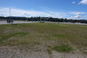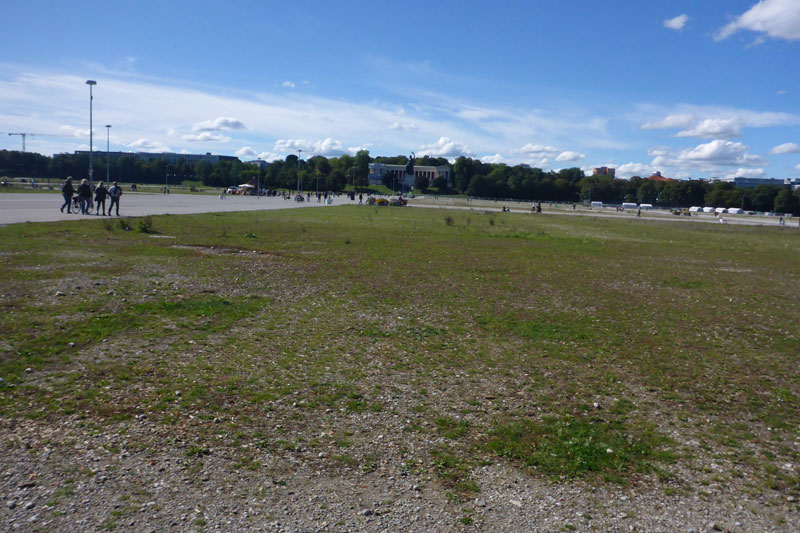Unmittelbar danach biegen wir auf der Westseite vom Fußweg wieder auf die Theresienwiese ab. Eine nennenswerte Begrünung ist auf dieser Freifläche nicht mehr vorhanden, zum Laufen geht’s dafür aber auch abseits der asphaltieren Budenstraßen ganz ordentlich. Ohne die Bierzelte und Fahrgeschäfte wirkt der leere Festplatz aber schon ziemlich öde. Ganz gut vorstellen kann ich mir aber, dass hier auch Pferderennen stattgefunden haben, so wie es z.B. am 12. Oktober 1810 der Fall war. Anlass für das Oktoberfest war die Hochzeit von Kronprinz Ludwig von Bayern und Prinzessin Therese, von ihr hat die Wiesn auch ihren Namen. Neben zahlreichen privaten und öffentlichen Feiern fand auch ein Pferderennen statt. Der Festplatz, der damals außerhalb der Stadt lag, wurde aufgrund seiner natürlichen Eignung ausgesucht. Der Sendlinger Berg, heute Theresienhöhe, diente als Tribüne für die 40.000 Zuschauer.