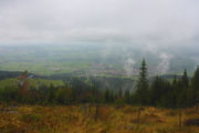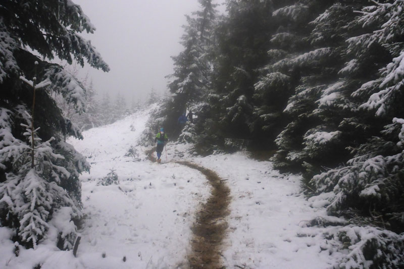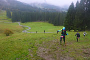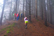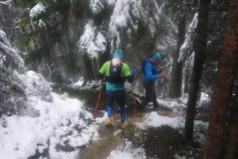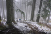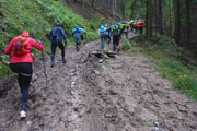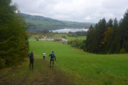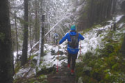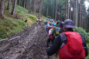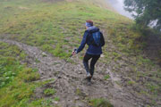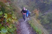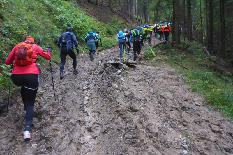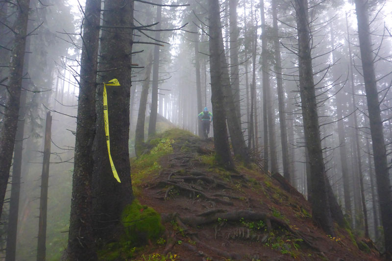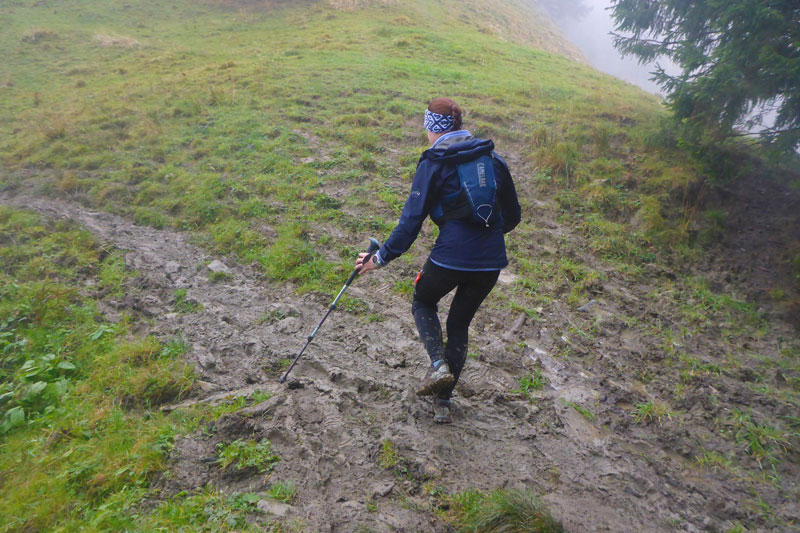 Wieder höchst fordernd geht’s vom Gipfel runter. Ich bin froh, Stöcke dabei zu haben, das ist wie eine kleine Lebensversicherung. Nach der Walddurchquerung wartet wieder eine bequeme Schotterstraße und ich kann etwas Gas geben. Die Sicht wird nach unten tatsächlich etwas besser, für kurze Zeit kann ich sogar durch ein Wolkenloch einen Blick bis ins Tal werfen. Als wirkliche Aussicht kann man das zwar noch nicht bezeichnen, aber immerhin. Nach oben ist‘s aber leider trostlos, alles noch zu. Für uns geht’s auch wieder auffi. Sehr schön und steil im Wald und auch wieder mit wunderbaren Schlammlöchern. Da macht mir das Fotografieren der Mitläufer besonders viel Spaß. Ansonsten ist das heute kein Vergnügen. Ständig muss das Objektiv gereinigt werden dabei verstreicht auch immer einiges an Zeit.
