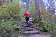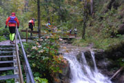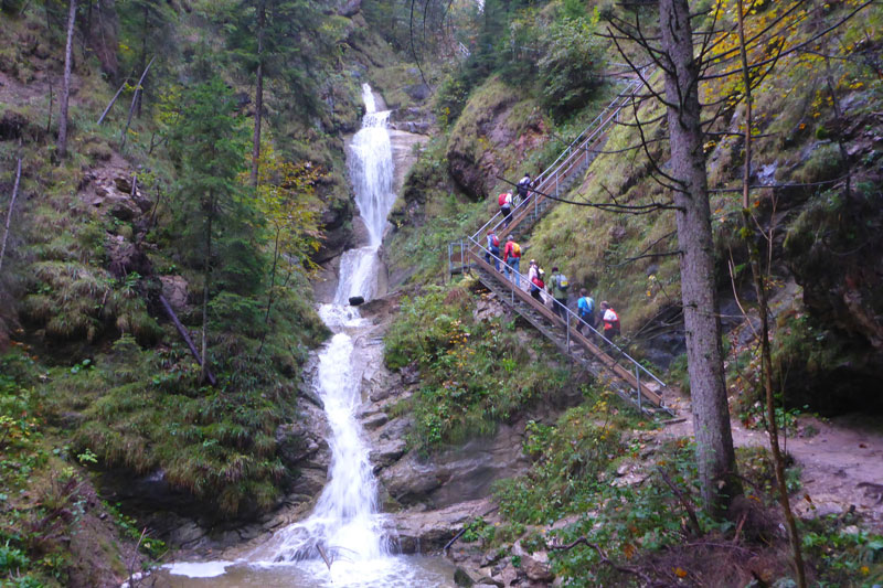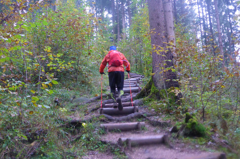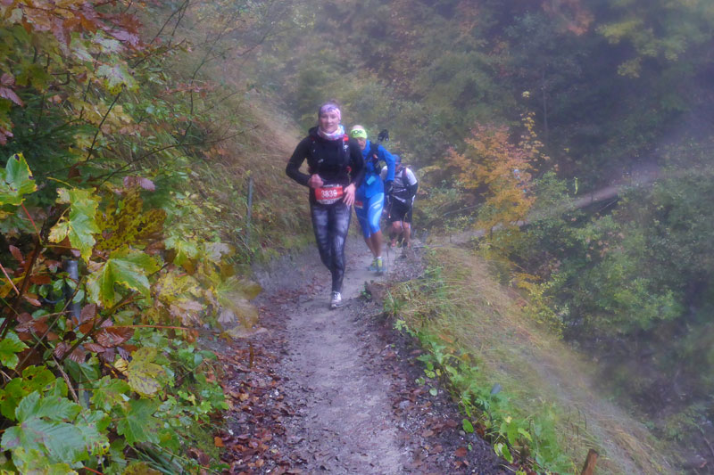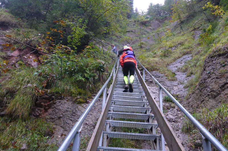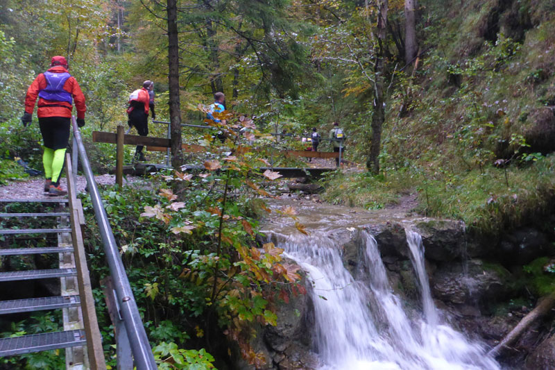 Unsere Zusatzschleife ist identisch mit der S-Runde. Den Wasserfallweg passieren wir im Gegensatz zum ersten Aufstieg auf der linken Seite, ausschließlich auf Naturwegen, sämtliche Brücken und auch die spektakuläre lange Stahlgitterleiter fallen somit weg, weiter oben vereinen sich die beiden Aufstiegsmöglichkeiten wieder. Als Alternative wird diese Routenführung auch Startern mit Hunden in der ersten Runde angeboten, damit die nicht übers Gitter müssen.