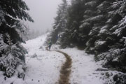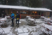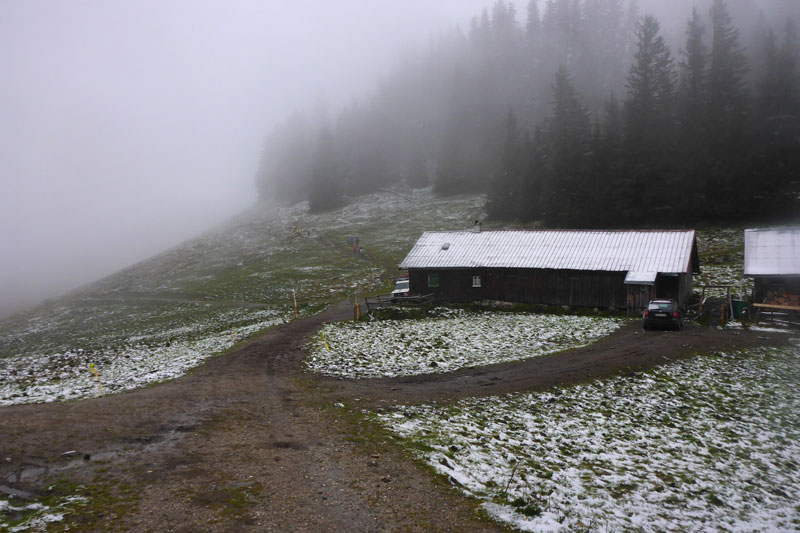 Ich bin heilfroh als ich endlich diesen brutal steilen Aufstieg hinter mir habe. Am Sportheim Böck wird immer noch siedend heißer Tee serviert, vom Zimt-Gugelhupf ist auch noch was da und auch der Schnee und die Nebelsuppe sind immer noch wie in der Früh.