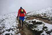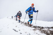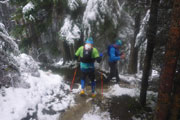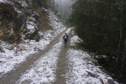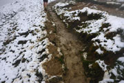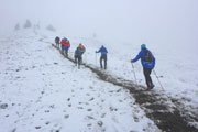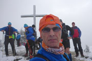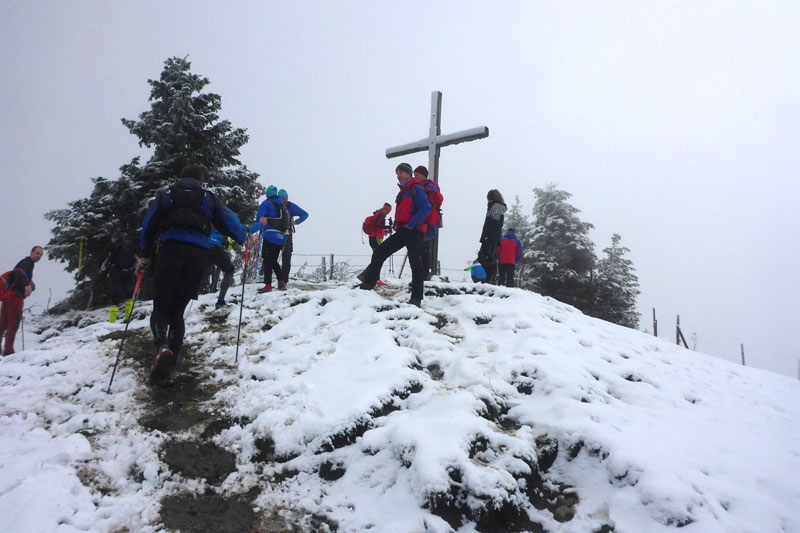 Nach einem U-Turn geht’s wieder aufwärts. Unser nächstes Ziel ist der Gipfel der Reuterwanne auf 1542 m Höhe. Es wird wieder Winter, verbunden mit viel Schnee und Matsch. Durch tiefe Schlammrinnen führt ein schmaler Pfad im zähen Nebel nach oben. Diesmal sogar bis zum Gipfelkreuz. Dort sind wieder mehrere Männer der Bergwacht postiert, wie überhaupt auf der gesamten Strecke, bei den heutigen Verhältnissen bestimmt kein angenehmer Job. Ich mag mir gar nicht vorstellen, was wir auf diesen freien Gipfel wohl für eine grandioses Panorama verpassen. Hilft ja nix, es könnt ja noch viel schlechter sein und von oben was runterkommen.