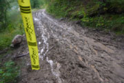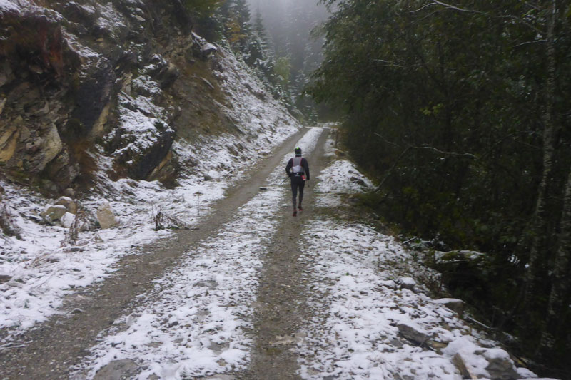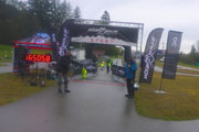 Jetzt geht‘s owie. Zur Sicherheit frage ich bei der Bergwacht noch nach, ob ich meine Stöcke einpacken kann. Definitv, durchgängig 6 Kilometer Schotterstraße warten auf mich, dann kommt aber noch das Finish. Nicht ganz so schnell wie an der Zipline, aber doch mit durchgängigem Tempo kann ich bis fast runter ins Tal brettern. Das schlammige Ende erwartet mich fünfhundert Meter vor dem Ziel. „Ja, so a Baaz“, der Weg hat sich nochmal deutlich verschlechtert. Wildsäue wären hier auch in ihrem Element. Mittlerweile führt noch eine zusätzliche Spur mitten durch den Wald, vermutlich haben die Teilnehmer sie selbst gespurt, da es auf dem Weg kaum mehr ein Halten gibt.