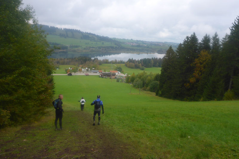 Der Grüntensee befindet sich schon in unserem Blickfeld, dazwischen liegt aber noch die morastige Wiese der Buron-Skiabfahrt. Ratsam ist der Blick auf den Boden sonst kann man schnell mal eintauchen. Durch den Campingplatz gelangen wir ans Ufer des Grüntensee. Dieser ist nicht natürlichen Ursprungs, sondern ein Stausee der Wertach und dient dem Hochwasserschutz und der Stromerzeugung. Die Aussicht auf den Wächter des Allgäus, den Grünten, hat ihm wohl seinen Namen beschert.