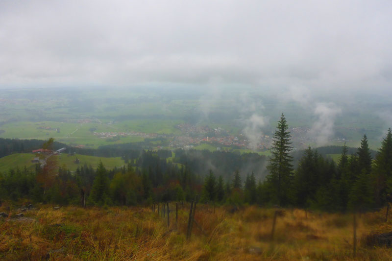Nachmittags um 14 Uhr fallen am Ortsrand von Nesselwang dann doch noch die ersten Regentropfen, die lohnen aber nicht mal das Auspacken einer Regenjacke. Die Strecke führt uns oberhalb des Trendsportzentrums vorbei, die Sprecher sind immer wieder mal heraufzuhören. Etwa 500 Meter vom Ziel entfernt, treffen wir wieder auf unseren ersten Schlammaufstieg von heute Morgen. An der Streckentrennung geht’s für die 30er jetzt direkt runter ins Ziel. Die „XL“ sieht einen erneuten Aufstieg zur Alpspitz vor. Ich pack’s nochmal an.