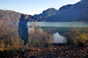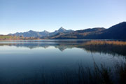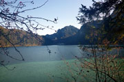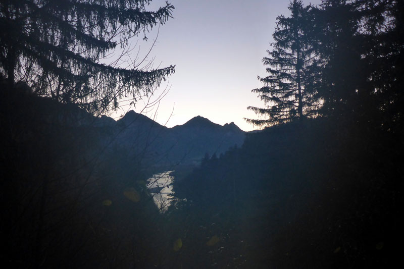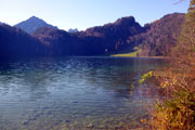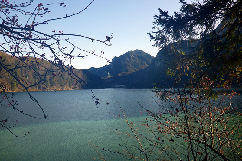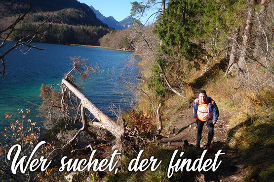 Bernie und ich umrunden nun auf großartigen Trails den Alpsee und haben so aus den unterschiedlichsten Blickwinkeln Sicht auf die beiden Königsschlösser. Denn auch Neuschwanstein zeigt sich immer wieder zwischen den Bäumen. Ich denke zum Märchenschloss muss ich nicht viel erklären. Dass es der Kini errichten ließ und es nie vollendet werden konnte, dürfte hinreichend bekannt sein. Obwohl ich schon so oft hier war, kann ich mich dennoch nicht sattsehen. Für mich ist Schloss Neuschwanstein eines der schönsten Gebäude, die bis heute errichtet wurden, wozu mit Sicherheit auch die geniale Lage beiträgt.