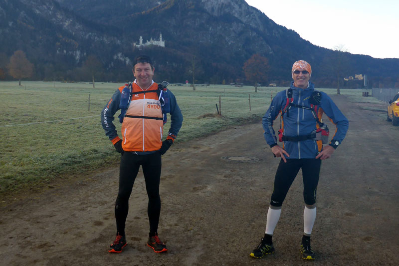 So machen wir uns am frühen Samstagmorgen auf den Weg nach Schwangau. Der Start erfolgt vor dem Gelände des TSV Schwangau in unmittelbarer Nähe von St. Coloman. Wir parken ein und sind erwartungsgemäß nicht allein. Nicht nur Bernie und ich hatten die Idee heute zu laufen. Die Anzahl der Läufer war aufgrund der unterschiedlichen Startzeiten stets überschaubar, so dass das Ganze keinen Veranstaltungscharakter hatte und somit auch den aktuellen Corona-Auflagen entsprach. Dennoch tat es gut mal wieder Läufer zu sehen und die Vorfreude bei Bernie und mir ist groß. Bevor wir loslegen können, gilt es jedoch erst mal die Ausrüstung zu checken. Die Uhr hatte ein GPS-Signal gefunden, genauso wie das Navi. Die Stirnlampe – für spätere Stunden – hat Saft und genügend Getränke sind im Rucksack verstaut. Die Handschuhe, die ich nur sicherheitshalber dabeihatte, zog ich erst mal an. Drei Grad unter Null, das war unerwartet frisch. Da es aber heute noch fünfzehn Grad warm werden soll, trage ich drei Schichten, um später ablegen zu können.