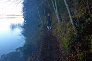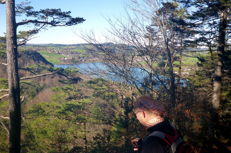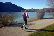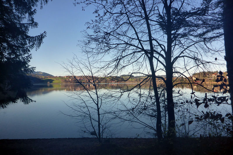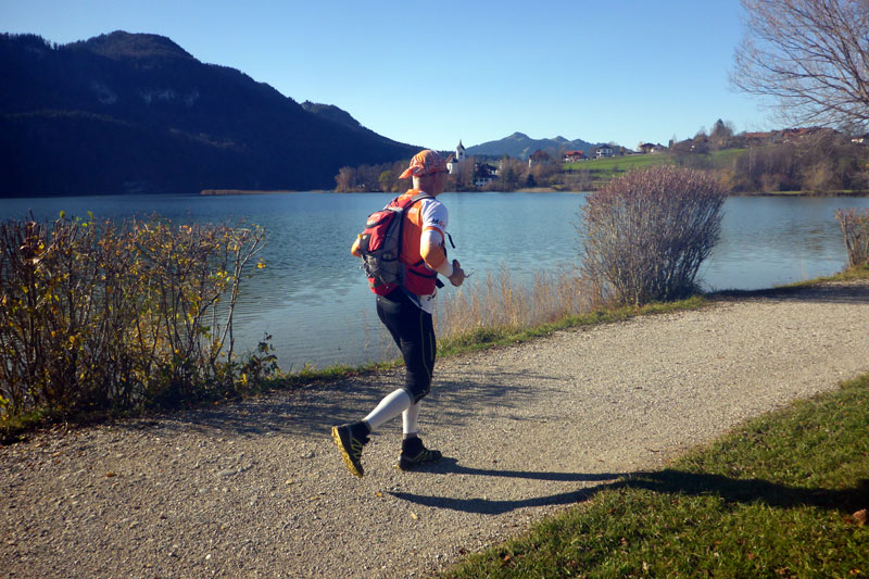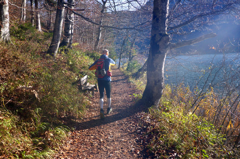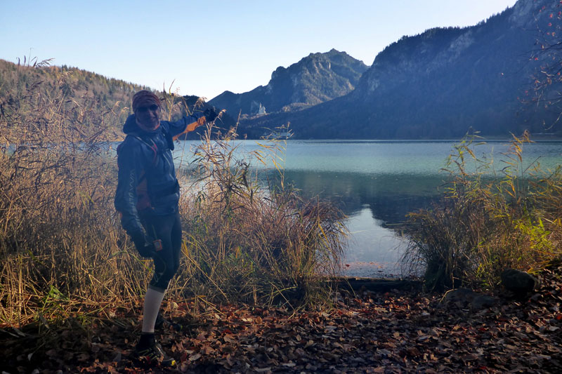 Bei unserer Umrundung des Alpsees, die uns bis Kilometer 14 führt, werden wir ab und zu von anderen Teilnehmern des KiniTrails überholt. Man grüßt sich, tauscht ein paar Worte aus und wünscht sich viel Spaß. Den haben Bernie und ich zu jeder Sekunde, auch mit unseren Navis kommen wir schon etwas besser zurecht, obwohl wir bis zum Ende immer wieder mal vom Weg abkommen werden. Das gehört bei so einem Lauf dazu und nicht selten stehen wir an einer Einmündung und diskutieren über den weiteren Verlauf der Strecke. Aber gleich wird es für uns einfacher. Es geht am Schwansee vorbei ins Richtung Füssen. Dieser Streckenabschnitt ist uns vom Königsschlösser Romantik Marathon bestens bekannt.