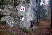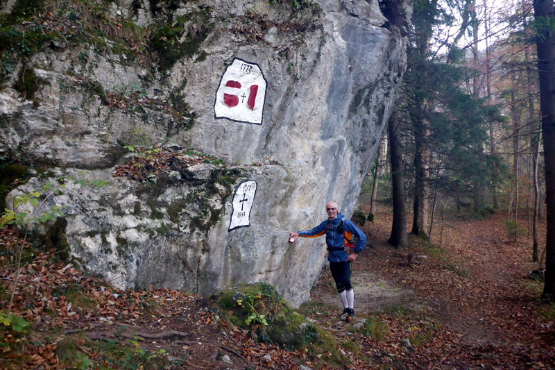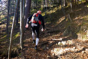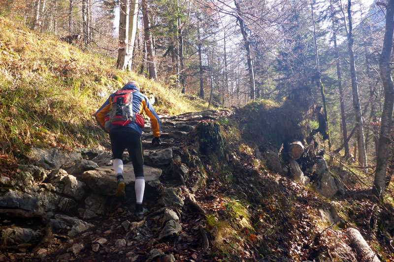 Schloss Neuschwanstein gibt uns zunächst einmal die grobe Richtung vor. Immer öfter blicken wir jetzt auf unser Navi, um ja keine Abzweigung zu versäumen, was uns aber nicht immer gelingt. Schon früh laufen wir auf richtig schönen Trails, die unter dem Herbstlaub oft kaum zu erkennen sind. Als wir auf der Zufahrtsstraße zum Schloss Neuschwanstein hochlaufen, dauert es nicht lange und wir müssen feststellen, dass wir schon wieder von der Strecke abgekommen sind. Gemeinsam machen wir uns auf die Suche nach der Abzweigung, die wir wohl übersehen haben und es ist nicht wirklich einfach. Irgendwann entdecken wir einen kaum sichtbaren Trail, der steil nach oben führt. Wir haben Spaß. Das Suchen nach der Strecke ist für uns neu und bedarf sicher noch etwas Übung.