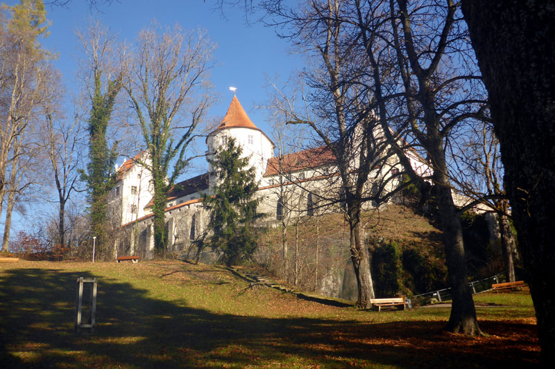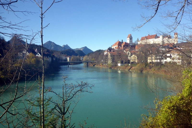 Es geht nun eine Zeit lang nahezu eben dahin und die Oberschenkel können sich etwas erholen. Kurz vor Füssen überqueren wir den Lech und haben einen faszinierenden Blick auf die Füssener Altstadt. Bis zum Benediktinerkloster St. Mang können wir uns schonen, dann geht das Trail-Abenteuer munter weiter. Über ein paar Stufen geht es hoch zum Stadtpark Baumgarten und wir haben eine tolle Sicht auf das prächtige Hohe Schloss von Füssen. Durch von Linden gesäumte Wege durchqueren wir den Park und teilen uns die Wege mit Familien, die die herbstlichen Sonnenstrahlen bei einem Spaziergang genießen. Am Ende des Parks laufen wir über einen Steg und haben einen Blick auf den „Zielhang“ des Königsschlösser Romantik Marathons.
