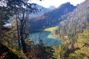 Umso weiter wir noch oben kommen, umso schöner wird der Blick auf den Alpsee, der unter uns liegt. Smaragdgrün schimmert der See in der Sonne und mich wundert es nicht, dass König Ludwig II, also der Kini, ihn zu seinem liebsten Badesee auserkoren hatte. Am tiefsten Punkt weist der Alpsee eine Tiefe von 62 Metern auf. Er ist 1,9 Kilometer lang und hat einen Umfang von gut fünf Kilometern. Zudem hat man immer wieder eine herrliche Sicht auf Schloss Hohenschwangau. Die ehemalige Burg wurde im 12. Jahrhundert erstmals urkundlich erwähnt und hatte bis ins 16. Jahrhundert diverse Eigentümer und wurde auch mehrfach schwer beschädigt. 1832 erwarb König Maximilian II, der Vater des Kinis das Schloss und ließ es im neugotischen Stil wiederaufbauen. Der Kini verbrachte seine Kindheit im Schloss Hohenschwangau und nutzte es bis zu seinem Tod als Sommerdomizil.