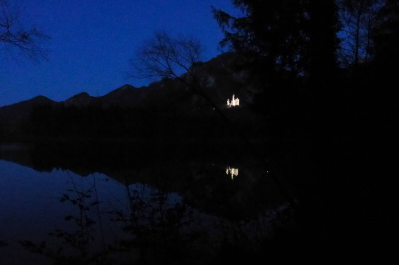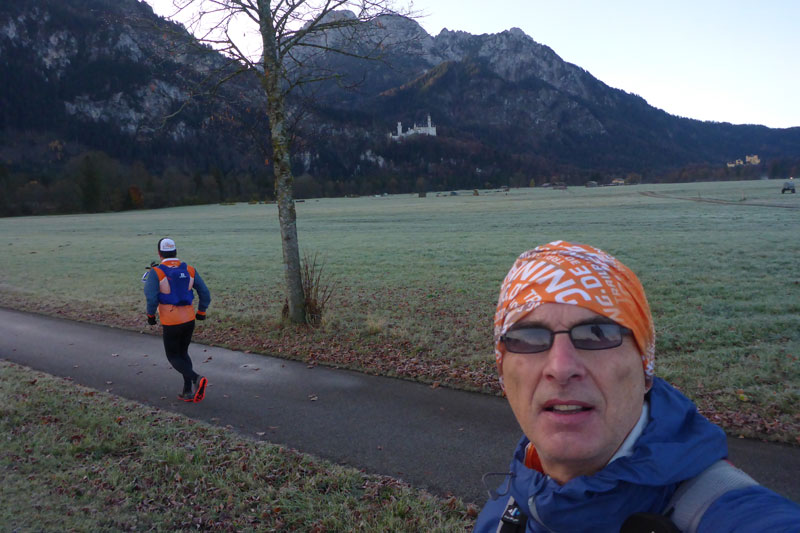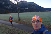 So improvisieren wir wegen der Dunkelheit etwas und verlassen am Schwansee den vorgegebenen Kurs. Auf direkten Weg über Hohenschwangau geht’s zurück ins Ziel. Natürlich nicht, ohne wenigstens ein paar Versuche unternommen zu haben, ein paar Bilder von den prächtig beleuchteten Königsschlössern zu schießen. Unsere Outdoorkameras sind für solche Bilder aber nicht besonders geeignet, daher ist das Ergebnis auch nur mäßig. Die finalen 3 km legen wir noch am Seitenstreifen der Colomanstraße zurück, uns reicht’s jetzt in der Nacht von den Trails, dazu ist es wieder lausig kalt geworden. Greppi’s Uhr ist erfahrungsgemäß ziemlich genau, unser Timing hat gepasst, er hat gut 52 km aufgezeichnet.