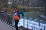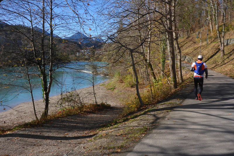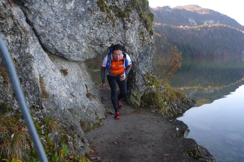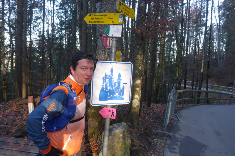 Über den Kalvarienberg geht es weiter zum Schwansee, der Anstieg ist nicht mehr dramatisch. Mittlerweile ist es Kuhnacht geworden, einzig Neuschwanstein und Hohenschwangau strahlen durch die Dunkelheit. Aber, wir haben ja unsere Lampen dabei, so kommen wir problemlos durch. Nach einer Streckenhochrechnung am Schwansee haben Greppi und ich mit unseren Verläufern mit 46 km, bereits etwa 4 km mehr auf unseren Uhren. Um in eine Wertung beim KiniTrail zu gelangen, müssen wir lediglich 52 km vorweisen, die Einhaltung der genauen Streckenführung des Originalkurses ist für den heurigen Wettbewerb keine Voraussetzung. Wegen der Corona-Problematik gibt es für Angemeldete sogar die Möglichkeit, den Lauf virtuell, auf einer ganz anderen Strecke durchzuführen.