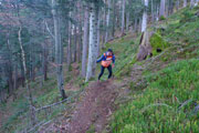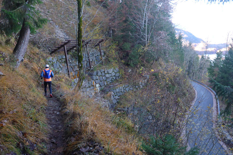 Zum etwa hundert Höhenmeter tiefer gelegenen Weißensee geht’s für uns erstmal einen Kilometer auf Asphalt runter, direkt auf der Saloberstraße. Beinahe verpasse ich wieder den Abzweig in den Wald, man darf eigentlich sein GPS kaum mal aus den Augen verlieren, sonst handelt man sich schnell Zusatzmeter ein. Das ist schon eine ganze neue Erfahrung.