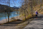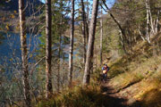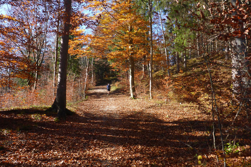 Unsere Route führt wieder zurück zum Alatsee, aber nicht auf dem direkten Weg über die Saloberstraße, sondern praktisch in drei langgezogenen Serpentinen über den Falkensteinkamm mit der Grenze zu Österreich. Auf dem 8 km langen Abschnitt ist auch der längste Anstieg mit fast 400 Höhenmeter zu bewältigen. Immer am Hang aufwärts führt uns die erste lange Serpentine bis fast an den Parkplatz zum Alatsee. Hier machen wir eine 180-Grad-Wende und entfernen uns wieder vom See, anfangs noch auf nicht allzu steilen Wirtschaftswegen. Zum Ende wird’s aber immer rustikaler und steiler.