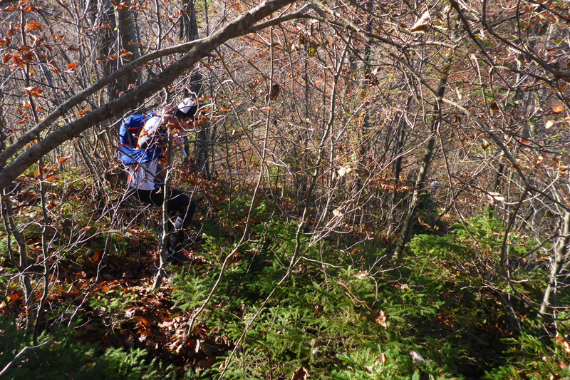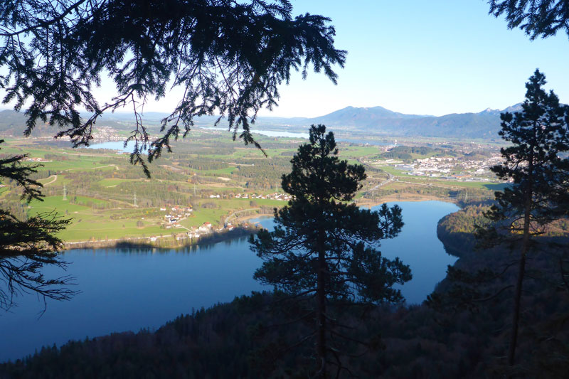 Der Weg zurück, auf fast nicht mehr sichtbaren Trails ist mühsam und ich bin etwas entnervt, irgendwie zeigt meine GPS nicht mehr richtig an. Mehrmals starte ich meinen Track neu, aber das Gerät funktioniert nicht mehr richtig. Es ist schon ein Kreuz mit der Technik, aber abenteuerlich. Greppi hat auch etwas Probleme in diesem schwierigen Terrain, meint aber, wir sind auf Kurs. Ich bin eigentlich orientierungslos, aber unter uns können wir immer wieder den Weißensee ausmachen. Dann wird’s scho passen. Im Wald ist es ab 14 Uhr schon relativ dunkel und es hat spürbar abgekühlt. Wir folgen jetzt zusätzlich auch Schildern und Wanderern, die auch zum Alatsee wollen. Vom Aussichtspunkt Vier-Seen-Blick bekommen wir eine tolle Aussicht auf den Forggen-, Hopfen-, Weißen- und Bannwaldsee geboten.