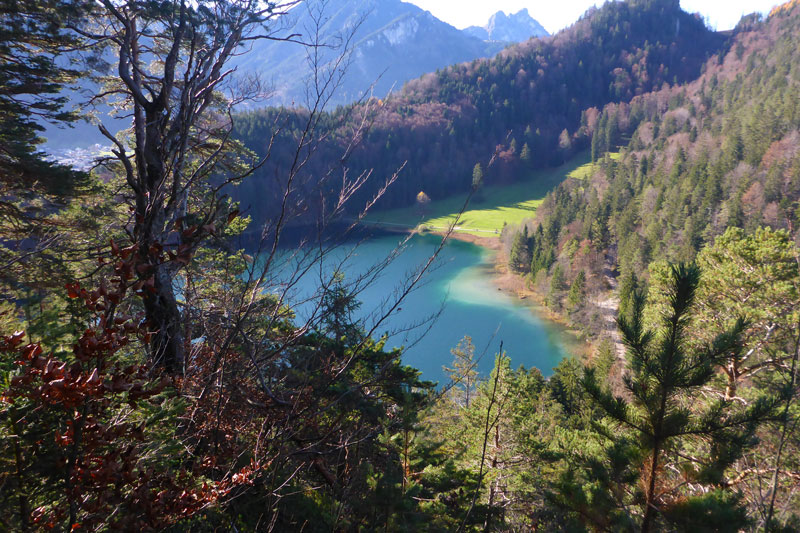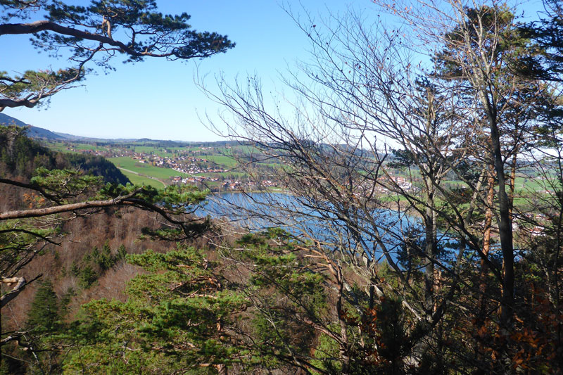 Hoch über dem Alatsee kommen wir raus, mit einem wunderbaren Überblick auf die Seen und ins Alpenvorland. Der Alatsee liegt auf 868 Metern Höhe in einer schluchtartigen Senke nur etwa 80 Meter nördlich des Falkensteinkamms mit der Grenze zu Österreich sowie gut 500 Meter Luftlinie südlich des tiefer gelegenen Weißensees. Liegt alles auch auf unserem Streckenplan. Wir steigen erstmal runter zum Alatsee.