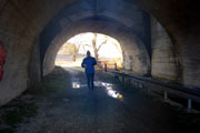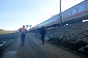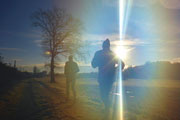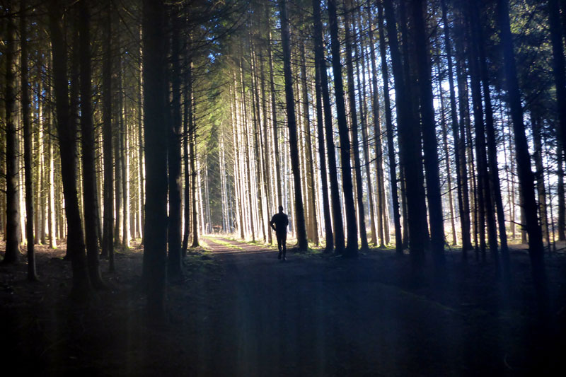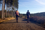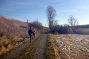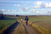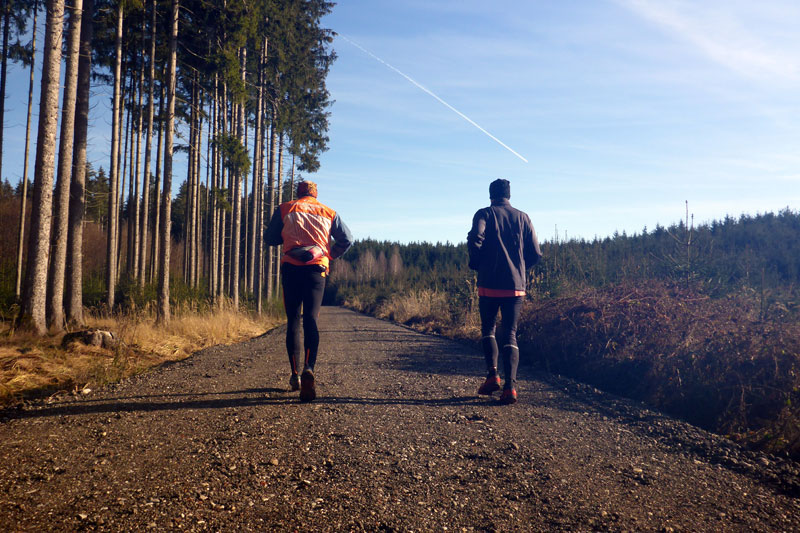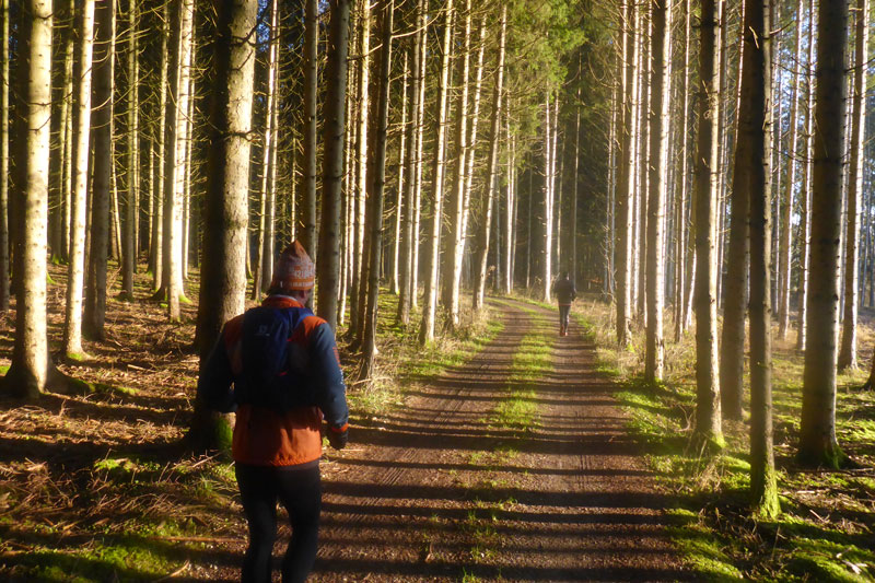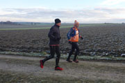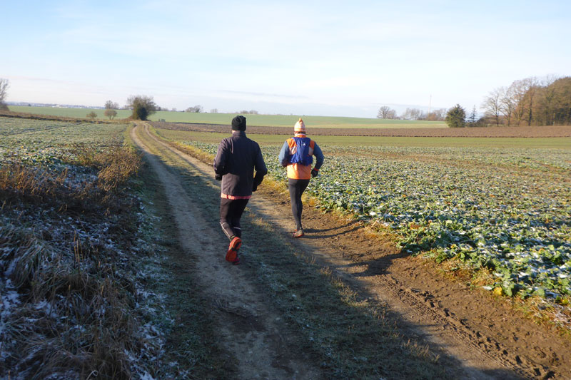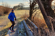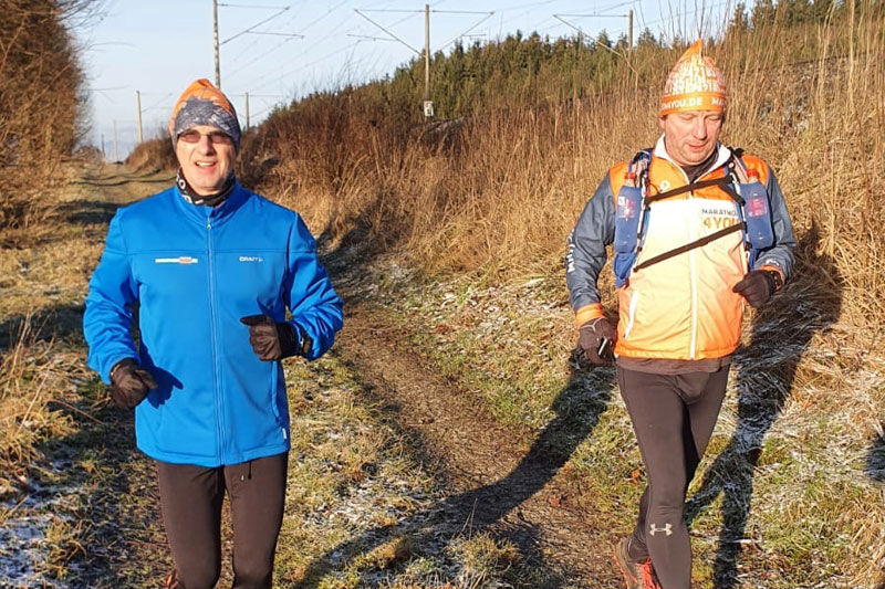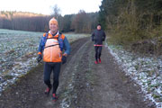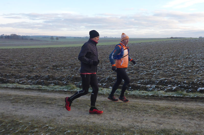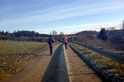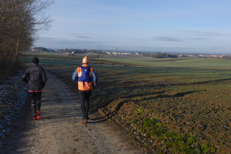 Gut gelaunt, mit dem Xmas-Triple vor Augen, starten wir wieder um 9 Uhr, wie bei den beiden vorhergehenden auch. Zum ersten Mal haben wir aber blauen Himmel über uns, nicht diese ungemütliche zähe Nebelsuppe. Dafür ist es aber auch sehr frisch, -2,5 Grad zeigt das Quecksilber. Greppi hat uns eine wellige Angelegenheit versprochen und es geht gleich leicht aufwärts los. Nach gut 2 km erreichen wir die Bahnlinie nach München. Verbunden mit zwei Tunnelunterquerungen, laufen wir 2 km an den Gleisen entlang. Die Sonne strahlt uns hier voll ins Gesicht und erhöht die Temperatur spürbar.