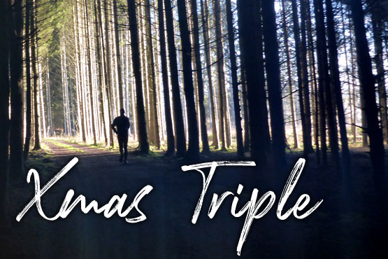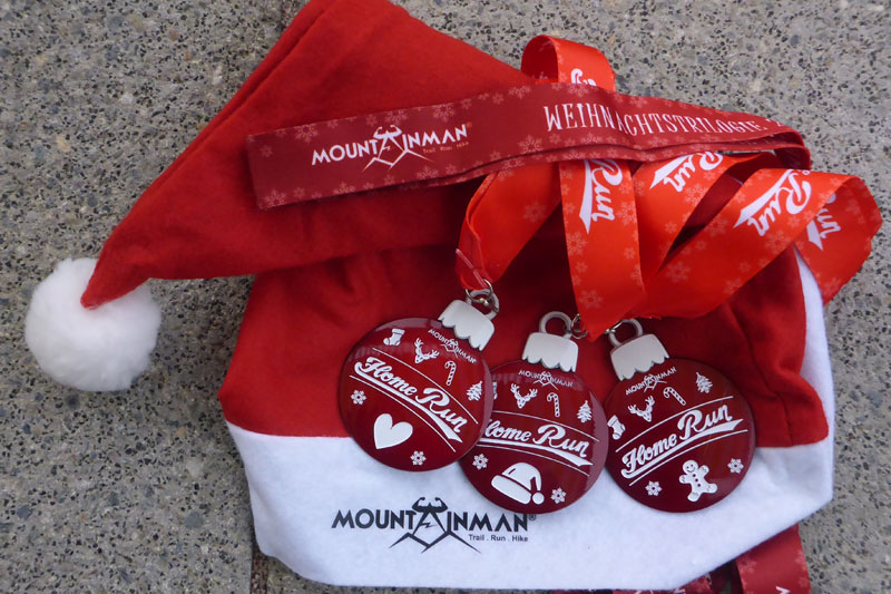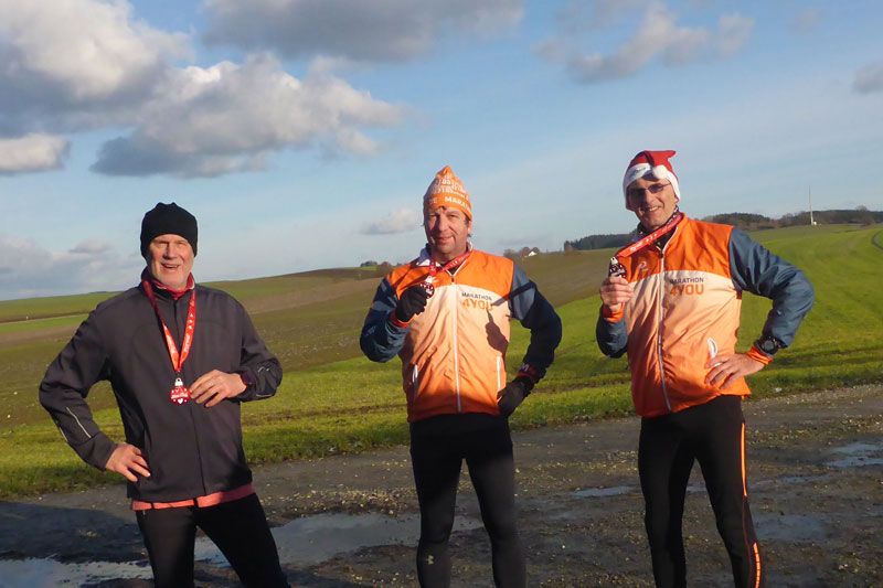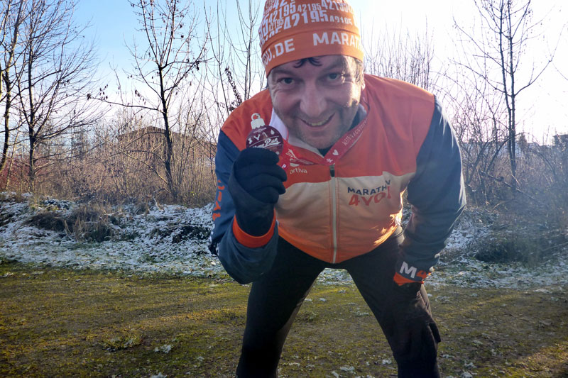 Die vierte Runde dürfen wir etwas verkürzen, uns reicht die genaue Marathondistanz. Im Hartwald verzichten wir auf die ausgedehnte Runde und schlagen eine direktere Route für den Rückweg ein. So kommt es, dass wir die finalen 1,5 km entgegengesetzt zu unseren bisherigen Runden laufen. Auf der Zielgeraden fehlen uns noch ein paar Meter auf den Uhren, so müssen wir noch eine dreihundert Meter lange Zusatzschleife, einen kleinen Anstieg hoch, drehen. Mit ca. 500 Höhenmetern beinhaltete der HappyRun die meisten Anstiege unserer Weihnachtstrilogie. Wir freuen uns, nach dem FCB haben auch wir das Triple geschafft.