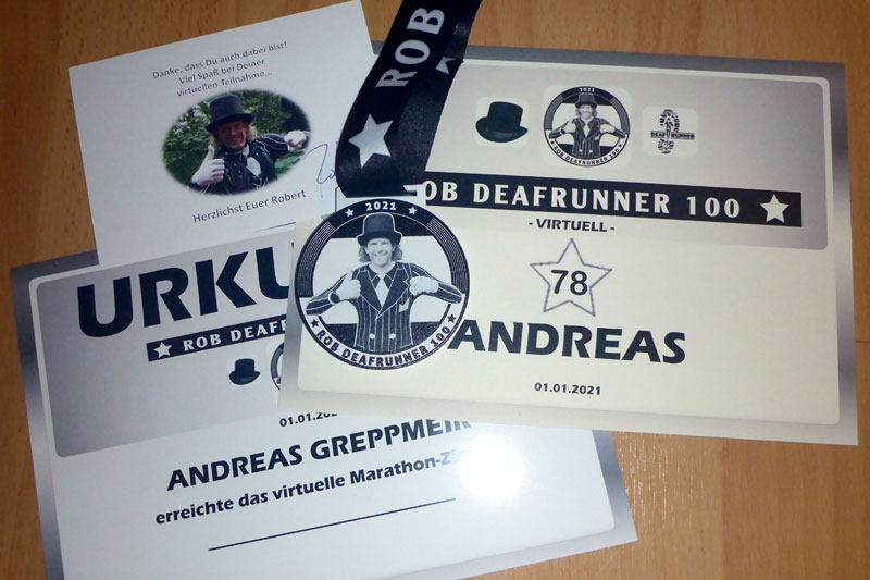 Ende Dezember tauchte der „Rob Deafrunner 100“ dann wieder im Internet auf. Natürlich konnte Roberts Jubiläumslauf nicht, wie von ihm erträumt, stattfinden und er schrieb ihn kurzerhand als virtuellen Lauf aus. Obwohl die Startplätze ja eigentlich vergeben waren, fragte ich bei Robert nach und ein paar Tage später kam die erfreuliche Nachricht, dass ich dank einer Absage einen Startplatz ergattern konnte. Letztendlich ließ Robert sogar noch Nachmelder zu, da zu viele Anfragen bei ihm eingingen. Das Anmelden übernahm Robert für mich und eine geringe Gebühr zur Abdeckung seiner Unkosten überwies ich ihm noch am selben Tag. So konnte ich schon zwei Tage später eine aufwendig gestaltete Startnummer und Urkunde im Briefkasten vorfinden. Doch das wahre Schmuckstück im Umschlag war die Medaille. Sie zeigt Robert in seinem typischen Laufoutfit, sowie den Schriftzug Rob Deafrunner 100. Ein wirklich tolles Stück.