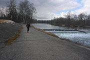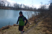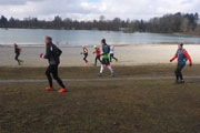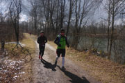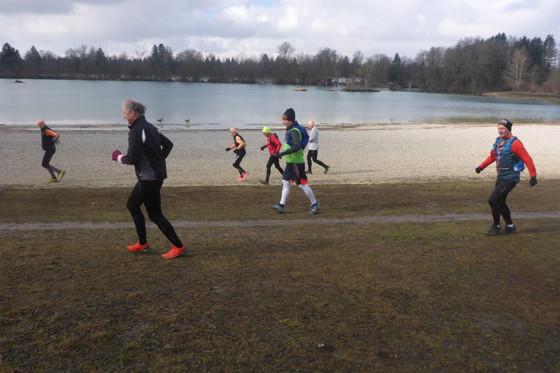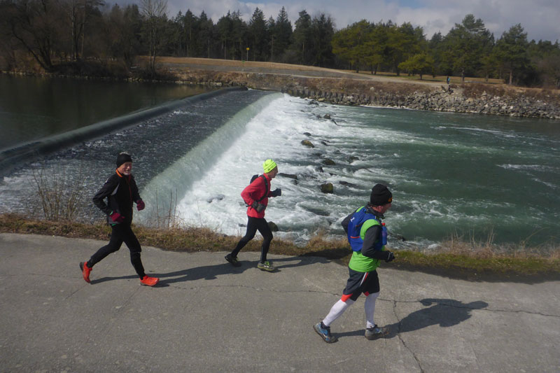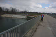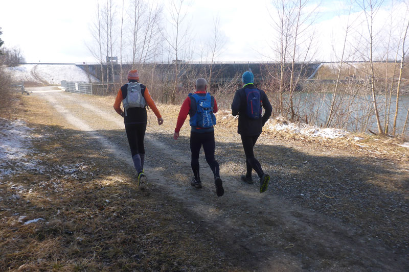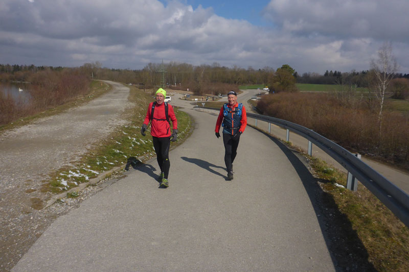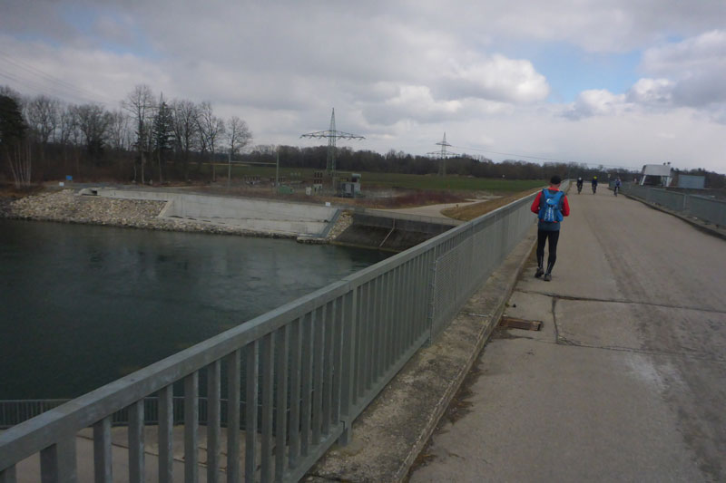 Mit Andy und Axel B. starte ich in die zweite Runde. Am Mandichosee gibt es eine kleine Streckenänderung, wir laufen die Seenrunde in entgegengesetzter Richtung, zudem lassen wir den westlich Bibertrail aus und nehmen stattdessen den Weg am Lochbach entlang. Vom Kraftwerk auf der Dammkrone können wir in einiger Entfernung Klaus ausmachen. Das spornt uns noch zusätzlich etwas an und wir erhöhen das Tempo und können ihn tatsächlich am Ende der Dammkrone erreichen.