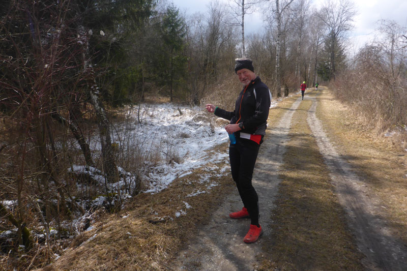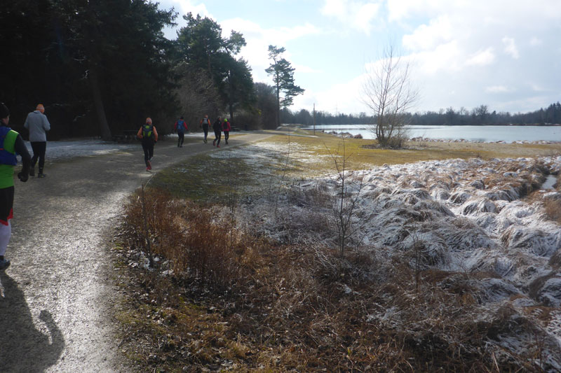 Nach einem Stück am Hagenbach entlang, wechseln wir bis zum Weitmannsee auf die Dammstraße, die ist erst vor ein paar Monaten neu planiert worden und daher brettleben. Charly und Klaus haben sich bereit einiges vom Mittelfeld abgesetzt. Als wir gerade am Parkplatz eintreffen, können wir gerade noch Klaus auf halber Höhe des Weitmannsees erspähen. Direkt neben unseren Autos ist am Parkplatz des Restaurant Seestern auch unsere erste Runde beendet. Ohne große Umwege können wir uns hier erst einmal verpflegen.