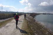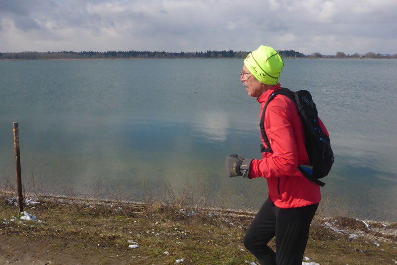 Nach vier Kilometer erreichen wir die Lechstaustufe 23 unter einem blauen Wolkenloch, die Sonne lässt uns die 1 Grad gleich wesentlich wärmer erscheinen, als es wirklich ist. Nach überqueren der Verbindungsstraße von Mering nach Königsbrunn geht’s rauf auf die 10 m höher liegende Dammkrone des Mandichosees. Der Mandichosee dient vornehmlich der Wasserkraftgewinnung und der Erholung. Ist der See voll gestaut, hat er eine Wasserfläche von ungefähr 160 Hektar. Bei gutem Wind sind die Surfer und auch zahlreihen SUP-ler hier in ihrem Element. Bis 2003 hieß der Stausee ganz lapidar Lechstaustufe 23. Erst 2003 benannte man ihn nach dem Bayern-Fürsten Mandicho um, der die etwa 2 km entfernte Gemeinde Merching gegründet haben soll.