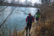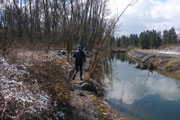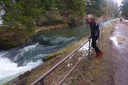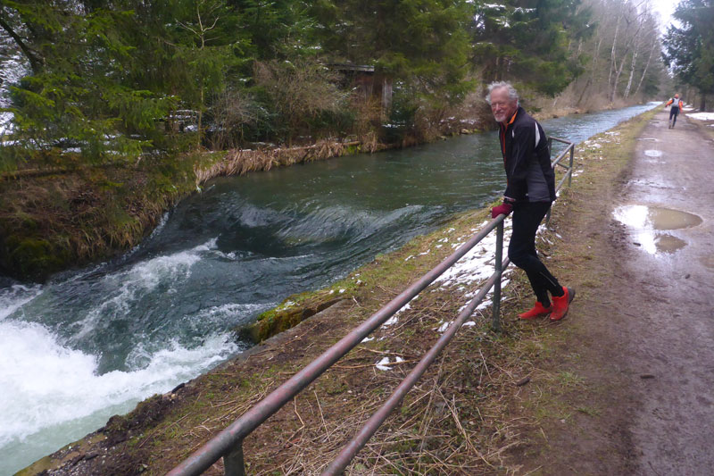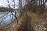 Die Kraftwerksanlage wurde 1982 fertiggestellt, eine Straße führt uns über das Kraftwerk und die Staufstufe auf die andere Lechseite. Lechaufwärts liegt hier ebenfalls ein Stausee, der aber wegen seiner nichtöffentlichen Straße nicht sehr frequentiert ist. Unser südlichster Punkt ist hier erreicht, es geht wieder zurück. Wir wählen hier auf der ersten Runde wieder den direkten Ufertrail, praktisch Teil 2 unseres Bibertrails. Vermutlich von Fischern ist er direkt ans Ufer getrampelt worden. Hier gilt es die Augen offen zu halten und auf den Untergrund zu richten. Die Biber waren hier ordentlich am Bauen, und haben viele Löcher in den Boden gebuddelt. Natur pur, wie immer wunderschön. Auf dem Kiesweg der Dammkrone des Mandichosees geht es zurück zur Lechstaustufe 23. Am Anfang der Seenrunde schien die Sonne, jetzt schneit es ein paar Minuten lang.