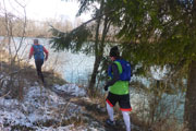Die Länge der Talsperrenkrone beträgt 4,3 Kilometer, wir laufen die erste Runde im Uhrzeigersinn links herum. Nach etwa 2 km erreichen wir den Zufluss am Lech und unseren Lieblingsabschnitt, den Bibertrail. Getauft haben wir ihn so vor vielen Jahren, als die Biber hier noch zahlreicher waren und somit auch des Öfteren Klettereinheiten über gefällte Bäume zu absolvieren waren. Der Single-Trail direkt am Lechufer ist wie immer ein Traum und lässt jedes Trailerherz höher schlagen. Nach 8 km erreichen wir die Lechstaufstufe 22 in Höhe von Unterbergen.