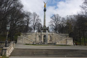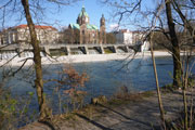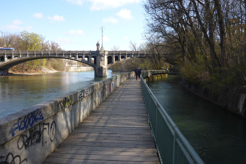 Um 10 Uhr geht’s los, nach 400 Metern erreichen wir das Maximilianeum im Stadtteil Haidhausen. Es beherbergt seit 1876 die Stiftung Maximilianeum für begabte Studenten aus der Pfalz und Bayern. Seit 1949 ist es zudem Sitz des Bayerischen Landtags. Wir unterqueren die Maximiliansbrücke, links von uns liegt in der Isar die Praterinsel. Nach einem Kilometer erreichen wir die Luitpoldbrücke mit Blick auf den Friedensengel. Die goldene Statue ist eine Nachbildung der Nike des Paionios, ein Synonym für einen militärisch errungenen Sieg. Mit Säule und Figur ist das Denkmal insgesamt 38 Meter hoch und erinnert an die 25 Jahre Frieden nach dem Deutsch-Französischen Krieg von 1870/71 und wurde 1899 eingeweiht.