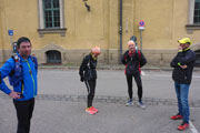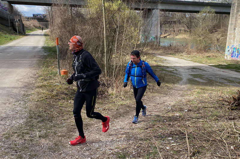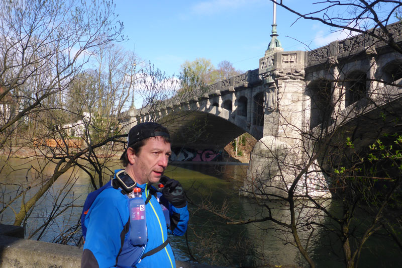 Im Stehen kommt man schnell ins Fösteln, so marschiere ich mit wärmender Regenjacke zurück zur Strecke. Erst 15 Minuten später trudelt Charly als nächster ein, ich bin doch etwas überrascht, da ich ihn ja eigentlich hätte überholen müssen. Des Rätsels Lösung ist ein weiterer Umweg von 500 Metern, da er komplett auf der anderen Isarseite runtergelaufen ist und so die etwas frühere Stoppung vor der Maximiliansbrücke nicht vornehmen konnte. Somit summiert sich seine Strecke heute auf 45,5 km. Dumm gelaufen. Unmittelbar danach treffen Andreas, Judith und Greppi ebenfalls ein.