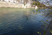 Wir bleiben aber vorerst noch an der Isar. Ganz auf Uferhöhe gibt es für 2 km einen wunderschönen Single-Trail, auf den mich Andreas explizit hinweist. Greppi und ich nutzen die willkommene Abwechslung, während Charly, Judith und Andreas den etwas höher liegenden und komfortableren Weg wählen. Nach der Leinthaler Brücke (km 6,6) steigen wir ein paar Meter auf und wechseln jetzt an den höher liegenden Mittlere-Isar-Kanal. Wunderbar lässt es auf dem Damm am Kanal entlang cruisen, auch ein paar Entchen genießen mit uns den sonnigen Abschnitt.