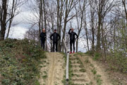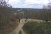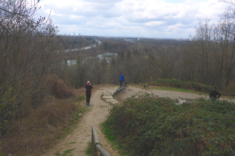 Bis zum Poschinger Weiher (km 9) bleiben wir am Isarkanal. Zur Abwechslung hat Andreas eine kleine Gipfelbesteigung eingebaut, 30 Höhenmeter geht es rauf auf den Hypoberg. Der Schuttberg aus dem Zweiten Weltkrieg bietet uns eine schöne Übersicht über München und ist vor allem bei Mountainbikern sehr beliebt, was man an den vielen ausgefahrenen Trails sehen kann.