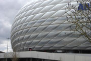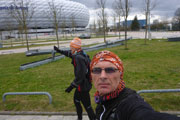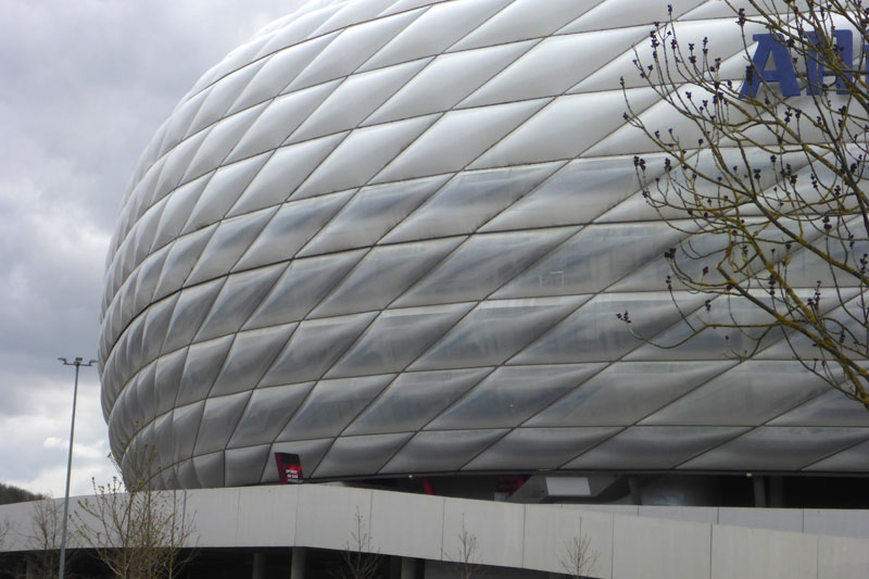 An der S-Bahn entlang gelangen wir zum „Bayern-Tempel“ in Fröttmaning. Eröffnet wurde die Allianz Arena 2005 und sie fasst über 70.000 Zuschauer. Heute ist kein Mensch zu sehen und wir können ungehindert daran vorbeiziehen und die eindrucksvolle Außenhaut mit seinen 2.784 Luftkissen bewundern. Beleuchtet bieten die LEDs dahinter ein Farbspektrum von 16 Millionen Farben.