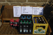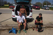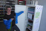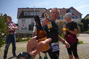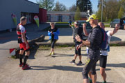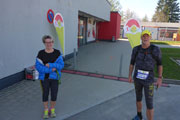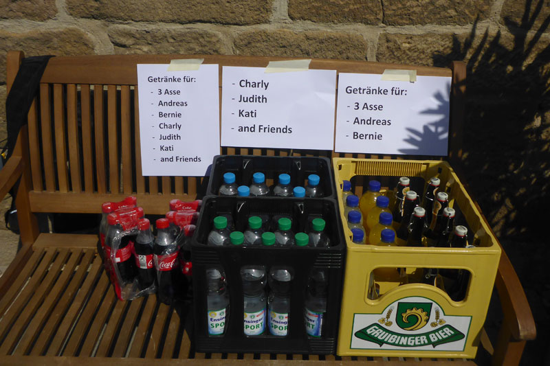 Vor dem Eingang der Mehrzweckhalle ist der Start- und Zielplatz mit Beachflags markiert und eine Zeitmessmatte ausgelegt. Äußerst positiv nehmen wir den gut gefüllten Kühlschrank im Eingangsbereich der Halle auf, aus dem wir uns kostenlos bedienen dürfen. Wer etwas Kleingeld dabei hat, darf freiwillig das Schweinchen füttern. Von Wasser über Cola bis zum Biermix ist alles dabei, wovon wir bestimmt nach absolvierter Strecke Gebrauch machen werden.