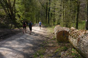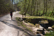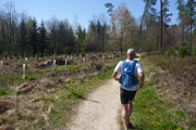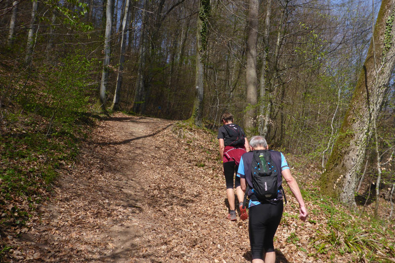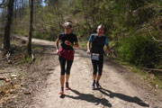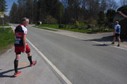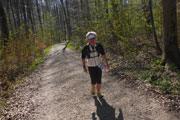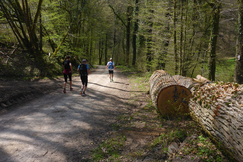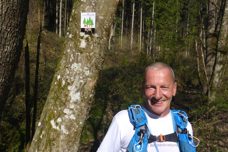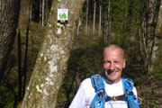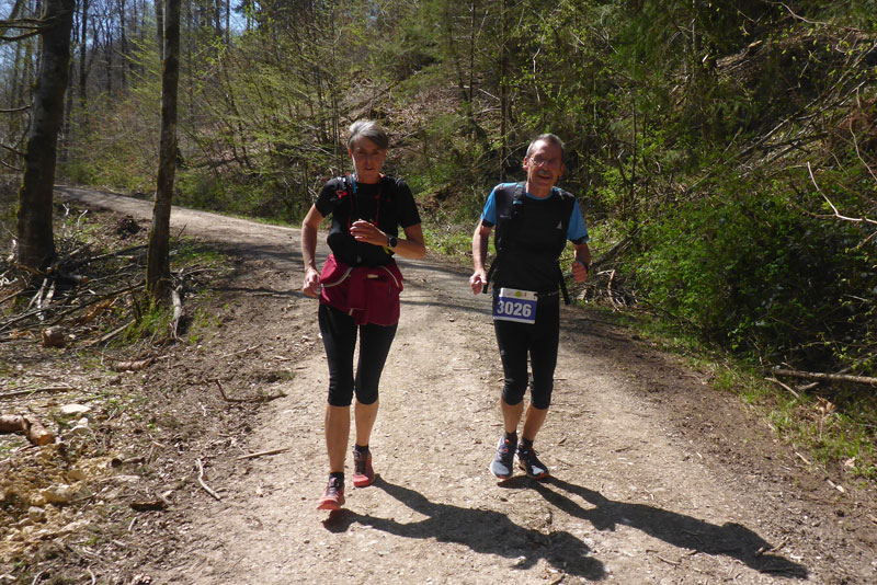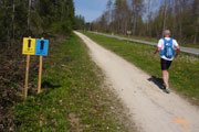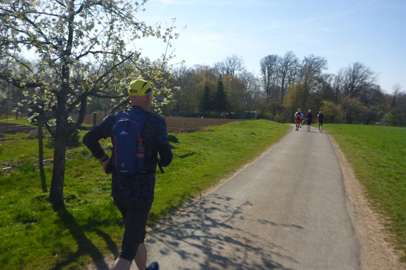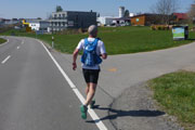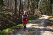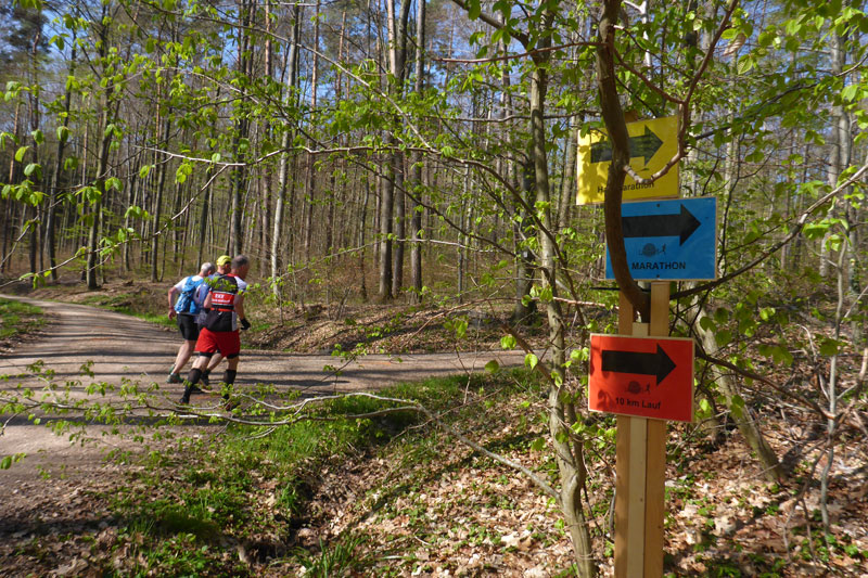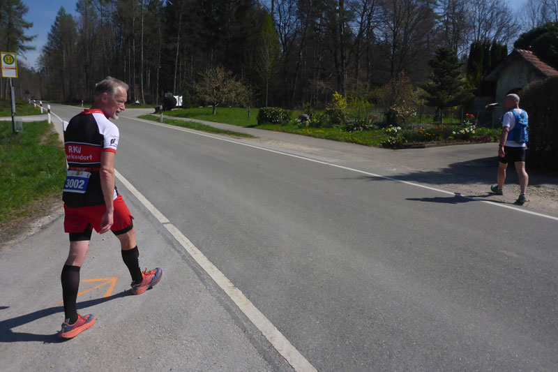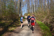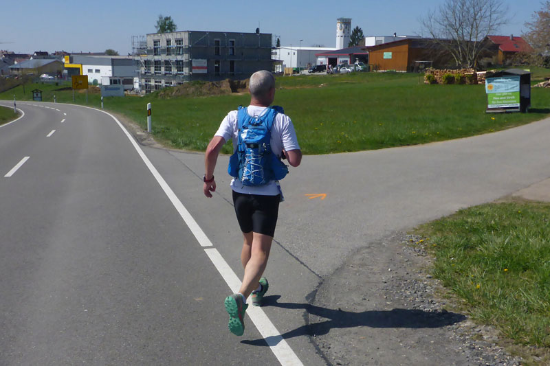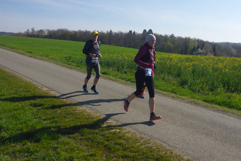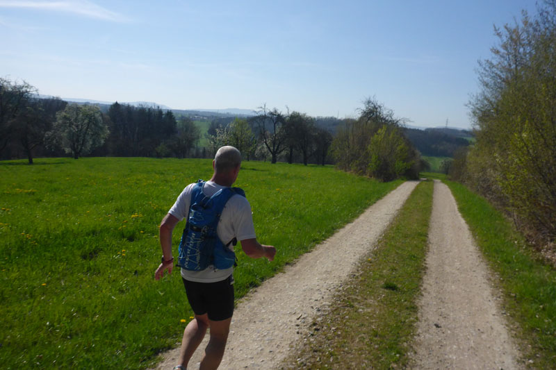Kurz danach geht’s den Kirnberg runter und in den Schurwald hinein. Bis km 9 verlieren wir fast 200 Höhenmeter. Mittlerweile haben wir angenehme Lauftemperaturen und das leichte Gefälle, mit ein paar Wellen versehen, bereitet äußerst viel Spaß zum Laufen. Vorbildlich ist die Strecke mit orangefarbenen Kreide-Pfeilen auf dem Boden und bei jeder gröberen Richtungsänderung mit Hinweisschildern markiert. Man muss jetzt eigentlich nur der richtigen Farbtafel folgen, da jeder der drei Distanzen eine eigene Farbe zugewiesen ist. Wer diese nimmer im Kopf hat, braucht nur kurz auf die Startnummer zu lugen. |